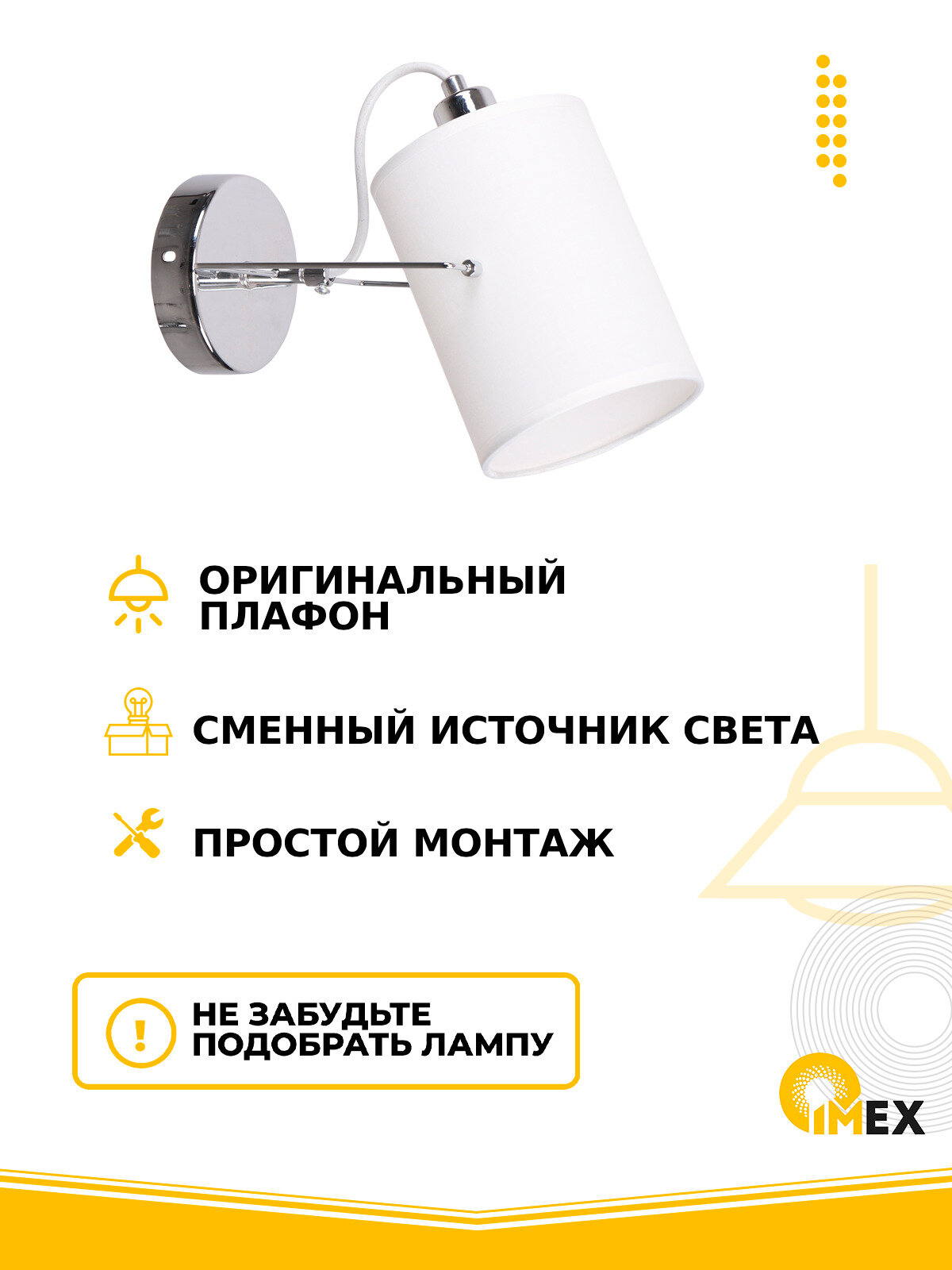 Бра - продукт известной компании Imex (Германия). Имеет максимальную мощность 60 Вт, освещает площадь до 3 кв. м. Отлично подойдет для таких мест, как гостиная, прихожая и коридор, спальня. Впишется в интерьеры следующих стилей: модерн.