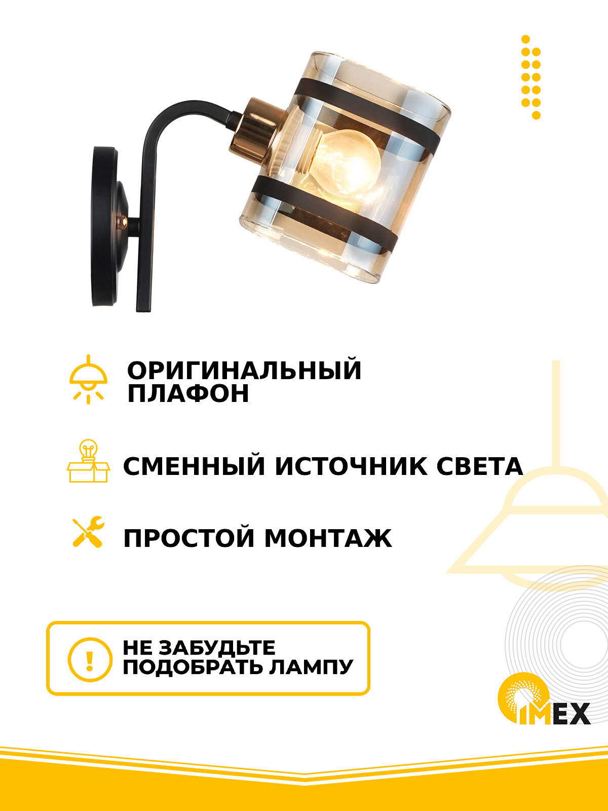 Бра IMEX разработан для комнат разного назначения. Такое оборудование может быть применено и в коридоре в зависимости от габаритов и формы. Комфортное приглушенное освещение способно заменить основное. Его можно использовать вместе с люстрой или моно. Светильники оснащены цоколем E27, имеют количество ламп 1 штук. Поэтому необходимо заказать одно бра или несколько в зависимости от площади и особенностей помещения. Мощность лампы 60 Вт имеет также первоочередное значение. Чем выше данный показатель, тем внушительнее площадь способно осветить источник света. Посмотрите на стиль модерн. Товар подойдет для установки Для прихожей. Мы предлагаем изучить с с 1 плафоном. Это поможет отобрать самое подходящее оборудование.