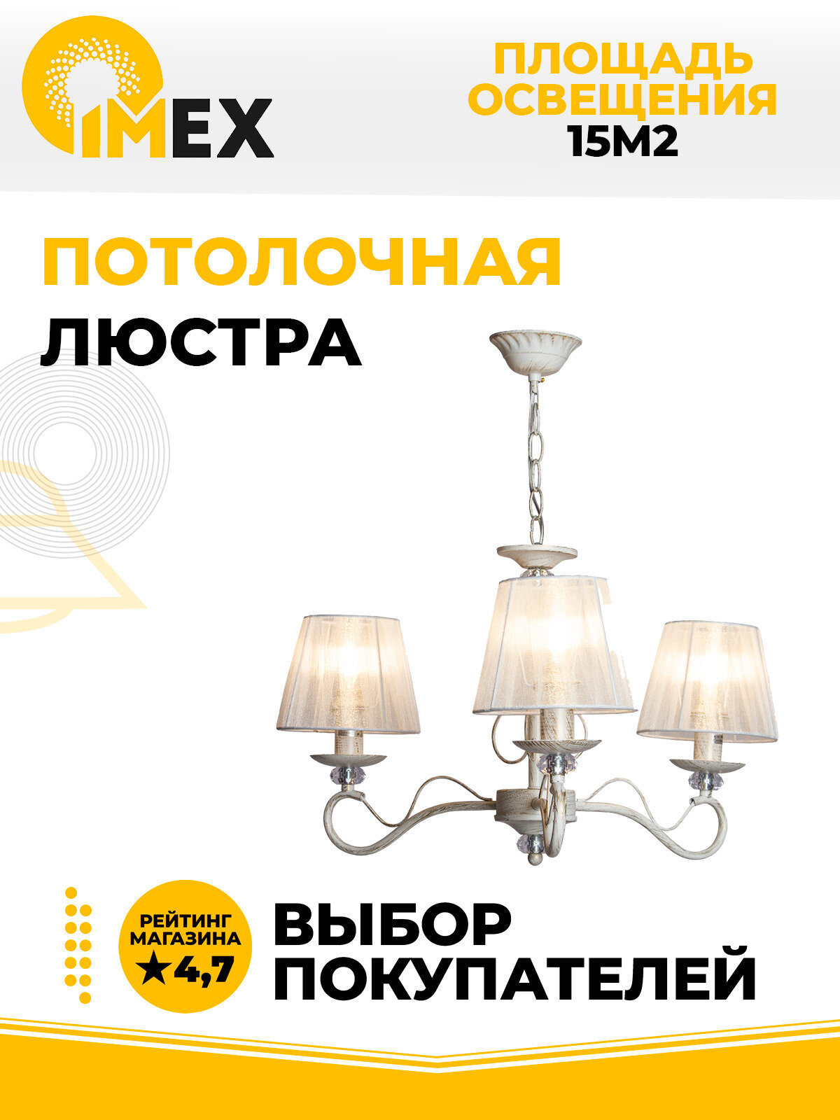 Подвесная люстра - продукт известной компании Imex (Германия). Имеет максимальную мощность 180 Вт, освещает площадь до 9 кв. м. Отлично подойдет для таких мест, как гостиная, кафе, спальня, кухня, над обеденным столом, кабинет. Впишется в интерьеры следующих стилей: классический.