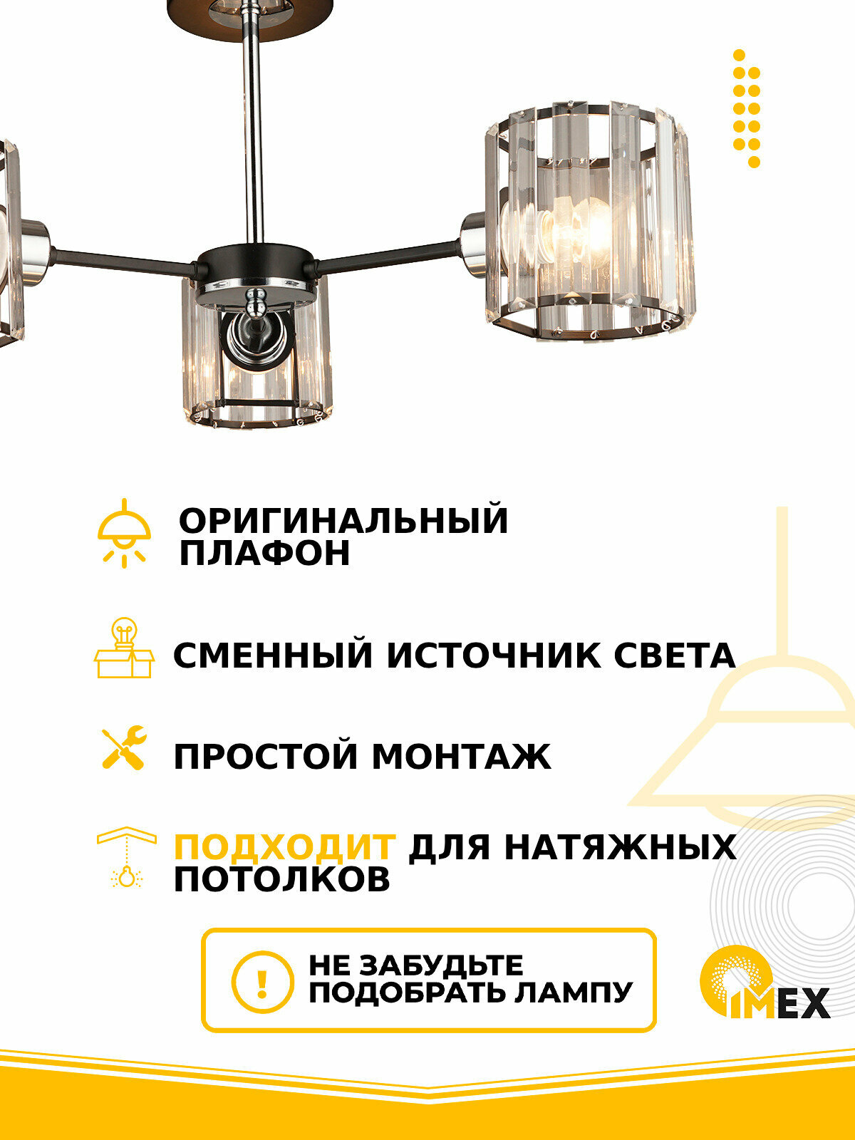 Потолочная люстра - продукт известной компании Imex (Германия). Имеет максимальную мощность 180 Вт, освещает площадь до 9 кв. м. Отлично подойдет для таких мест, как гостиная, спальня, кухня, кабинет. Впишется в интерьеры следующих стилей: модерн.
