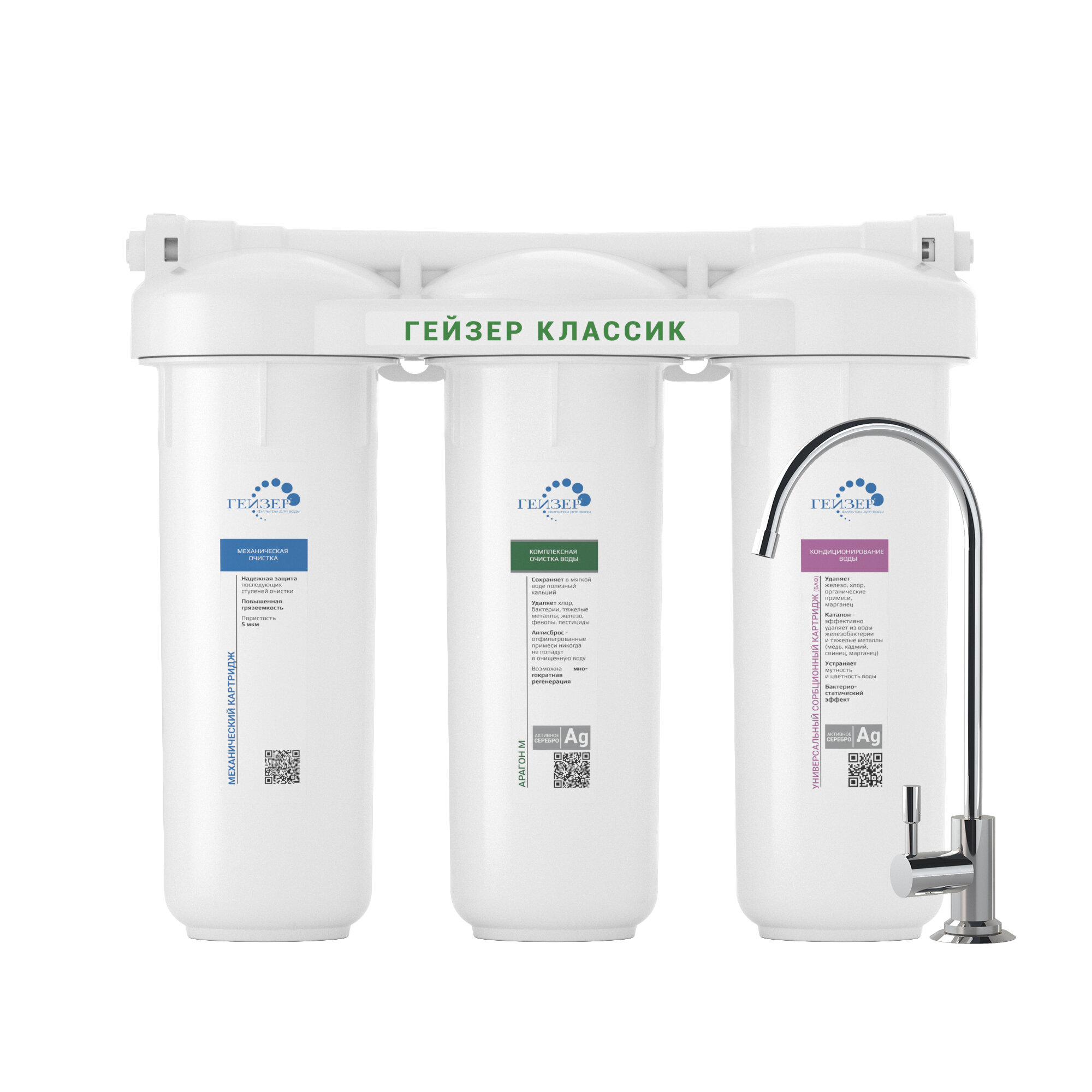 Трехступенчатый фильтр «Гейзер Классик М» для очистки мягкой воды. Признаки мягкой воды: плохо смывается мыло и шампунь, коррозия сантехники. Самая совершенная и оптимальная система очистки воды для каждого дома. Позволяет получать неограниченное количество воды питьевого класса из отдельного крана чистой воды. Уникальная защита вашей семьи от любых загрязнений, какие могут попасть в водопровод, включая прорыв канализационных стоков и радиационное заражение. Гейзер 3 - это один из лучших фильтров на российском рынке, фильтр с оптимальным сочетанием цена/качество/удобство использования. Состав картриджей фильтра Гейзер Классик М: 1-я ступень очистки (картридж PP 5 мкр). Ресурс 20000 литров. 2-я ступень очистки (картридж Арагон М). Ресурс до 7000 литров. 3-я ступень очистки (картридж БАФ). Ресурс 12000 литров. Назначение картриджей: 1-я ступень (картридж PP 5 мкр). Механическая фильтрация. Эти картриджи применяются в бытовых фильтрах для очистки воды от грязи, взвешенных частиц и нерастворимых примесей. Этот недорогой картридж первым принимает удар на себя и защищает последующие ступени системы очистки воды от быстрого загрязнения. В условиях возможных грязевых выбросов в водопровод это простой и эффективный способ защиты картриджей тонкой очистки для бытовых фильтров для воды. Вышедший из строя картридж механической очистки быстро и просто заменяется, зато остальные фильтроэлементы работают дольше и с максимальной эффективностью. Картридж Изготовлен из вспененного полипропилена. 2-я ступень (картридж Арагон М ). Арагон-М – картридж из материала Арагон, разработанный для очистки мягкой воды. Имеет 3 уровня фильтрации (механический, ионообменный и сорбционный). Внутрь картриджа Арагон-М можно установить минерализатор В(Ca), обогащающий воду полезным кальцием. 3-я ступень (картридж БАФ). Предназначен для очистки питьевой воды и может быть использован как одноступенчатый фильтр, так и в составе тройки на 2-ой и 3 –й ступени. Эффективно удаляет: твердые частицы, хлор, хлорорганические соединения, бензол, фенол, органические соединения, нефтепродукты, пестициды, железо, медь, марганец, ртуть, ионы тяжелых металлов, мутность, цветность, неприятные привкусы и запахи, бактерии и вирусы определенного ряда и др. Основное предназначение очистка воды от остаточного хлора, органических соединений и железа при содержании до 2 мг/л.