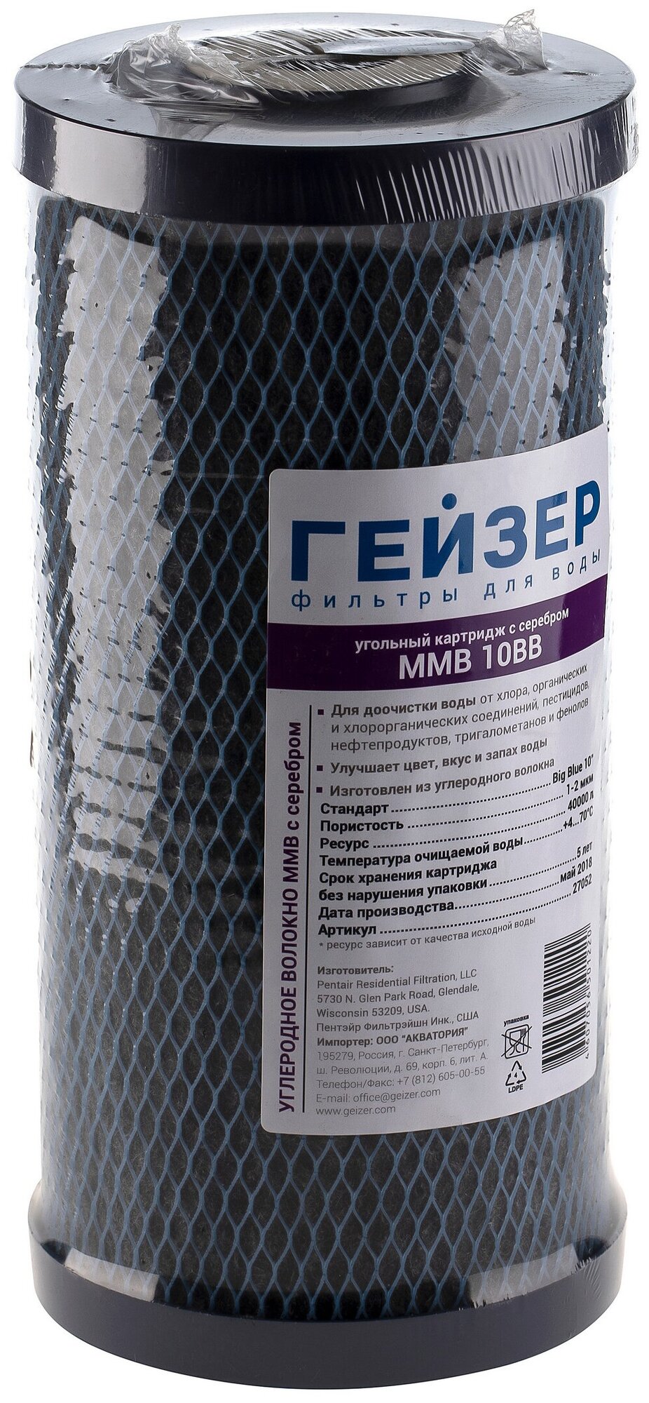 Изготовлен из высококачественного углеродного волокна, обладающего большей поверхностью поглощения и повышенным ресурсом в сравнении с другими сорбентами. Эффективно очищает воду от свободного хлора, органических и хлорорганических соединений. Устраняет неприятные запахи и посторонний вкус. Добавка серебра обеспечивает бактериостатический эффект.