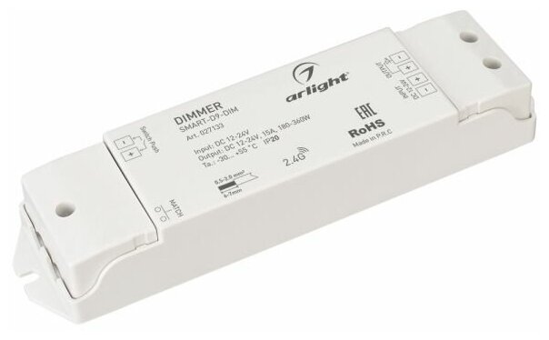 Диммер для монохромной светодиодной ленты (ШИМ). Питание/рабочее напряжение 12-24VDC, максимальный ток 15A на канал, 1 канал, максимальная мощность 180-360W. Винтовые клеммы. Корпус - PVC. Габариты 175x45x27 мм. Управляется пультами и панелями серии SMART (поставляются отдельно).