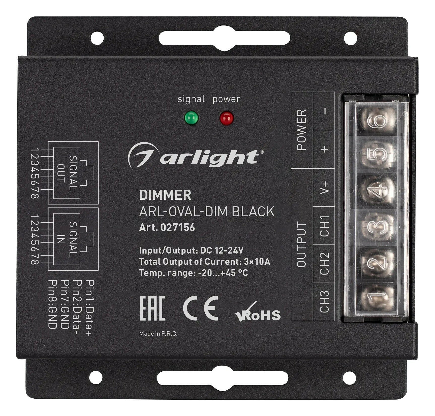 Диммер (овальный черный радиопульт с 5 кнопками и сенсорным кольцом). Управление яркостью с помощью сенсор. кольца, 12-24V, 360-720W, 10A/канал, 3 параллельных канала. Габариты диммера 91x70x24 мм, габариты пульта 114х56х23 мм.