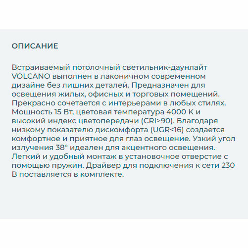 Встраиваемый потолочный светильник-даунлайт VOLCANO выполнен в лаконичном современном дизайне без лишних деталей. Предназначен для освещения жилых, офисных и торговых помещений. Прекрасно сочетается с интерьерами в любых стилях. Мощность 15 Вт, цветовая температура 4000 K и высокий индекс цветопередачи (CRI>90). Благодаря низкому показателю дискомфорта (UGR