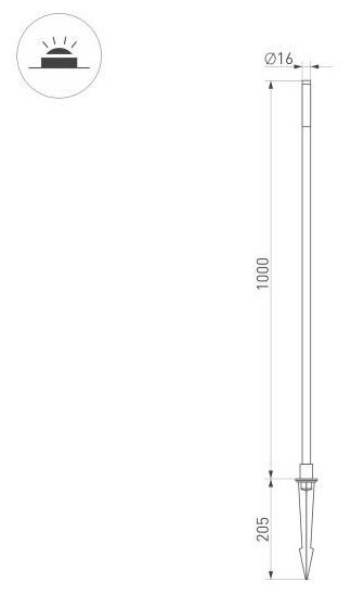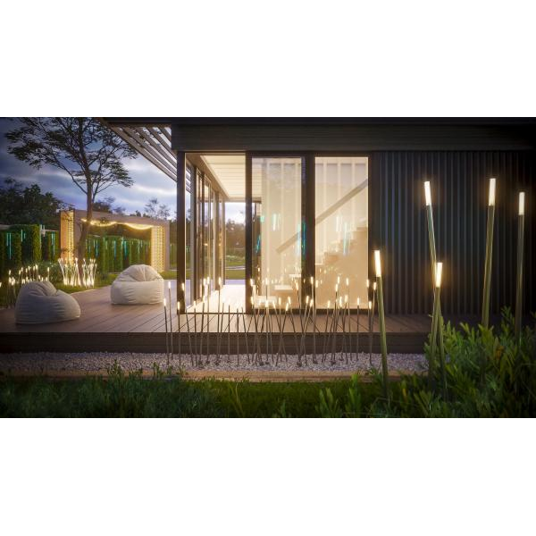 Декоративный ландшафтный светильник. Мощность 1.4 Вт, св. поток 35 лм, 25 лм/Вт, теплый 3000 K, CRI>80, угол 110°, напряжение питания 24 В. Темно-серый фигурный корпус из алюминия, экран PMMA, степень защиты IP65. Размер: диаметр 16 мм, высота 1000 мм. Монтаж в грунт. Допускается регулирование светового потока ШИМ.
