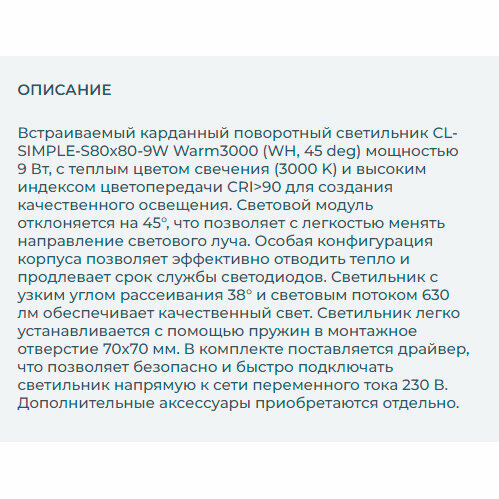 Встраиваемый карданный поворотный светильник CL-SIMPLE-S80x80-9W Day4000 (BK, 45 deg) мощностью 9 Вт, с дневным цветом свечения (4000 K) и высоким индексом цветопередачи CRI>90 для создания качественного направленного освещения. За основу поворотного механизма светильника взят принцип кардана. Световой модуль отклоняется на 45°, что позволяет с лёгкостью регулировать направление пучка света и его концентрацию на определенной зоне. Особая конфигурация корпуса из черного алюминия позволяет эффективно отводить тепло, продлевая срок службы светодиодов. Светильник с узким углом рассеивания 45° и световым потоком 630 лм отлично подходит для локальной акцентной подсветки витрин, прилавков магазинов, бутиков и стендов выставочных залов. Популярно совместное использование с трековыми системами или светильниками Downlight. Легко устанавливается с помощью пружин в монтажное отверстие 70х70 мм. В комплекте поставляется драйвер, что позволяет безопасно и быстро подключать светильник напрямую к сети переменного тока 230 В. Диммирование возможно при замене штатного драйвера.