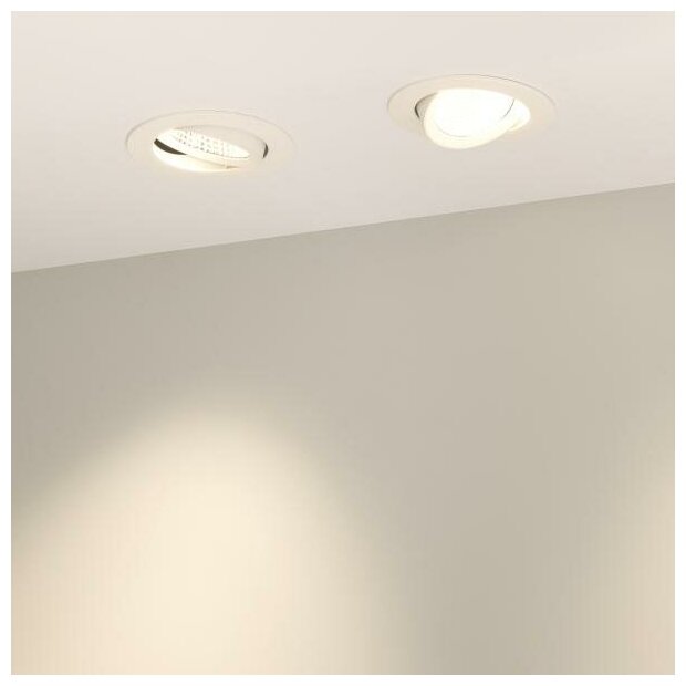 Встраиваемый поворотный светильник LTD-POLAR-TURN-R80-5W Warm3000 (WH, 36 deg, 230V) мощностью 4.5 Вт, с теплым цветом свечения (3000 К) и низким коэффициентом дискомфорта UGR80, световым потоком 400 лм и узким углом излучения 36° предназначен для направленного освещения торговых, офисных, жилых и других помещений. Световой модуль может отклоняться на 30°, позволяя мгновенно менять направление света. Светильник легко устанавливается с помощью пружин в монтажное отверстие Ø 60-70 мм. Благодаря встроенному драйверу светильник безопасно и быстро подключается напрямую к сети переменного тока 230 В.