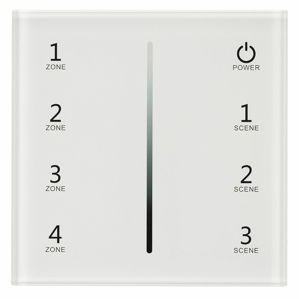 Встраиваемая сенсорная стеклянная панель 2.4 ГГц, цвет белый. Для управления яркостью с помощью сенсорной полосы. Питание/рабочее напряжение AC 85-265V, 4 зоны управления, память 4 сцен. Функция управления DMX512 устройствами. Габариты 86х86х36 мм. Панель совместима с диммерами и пультами серии SMART.