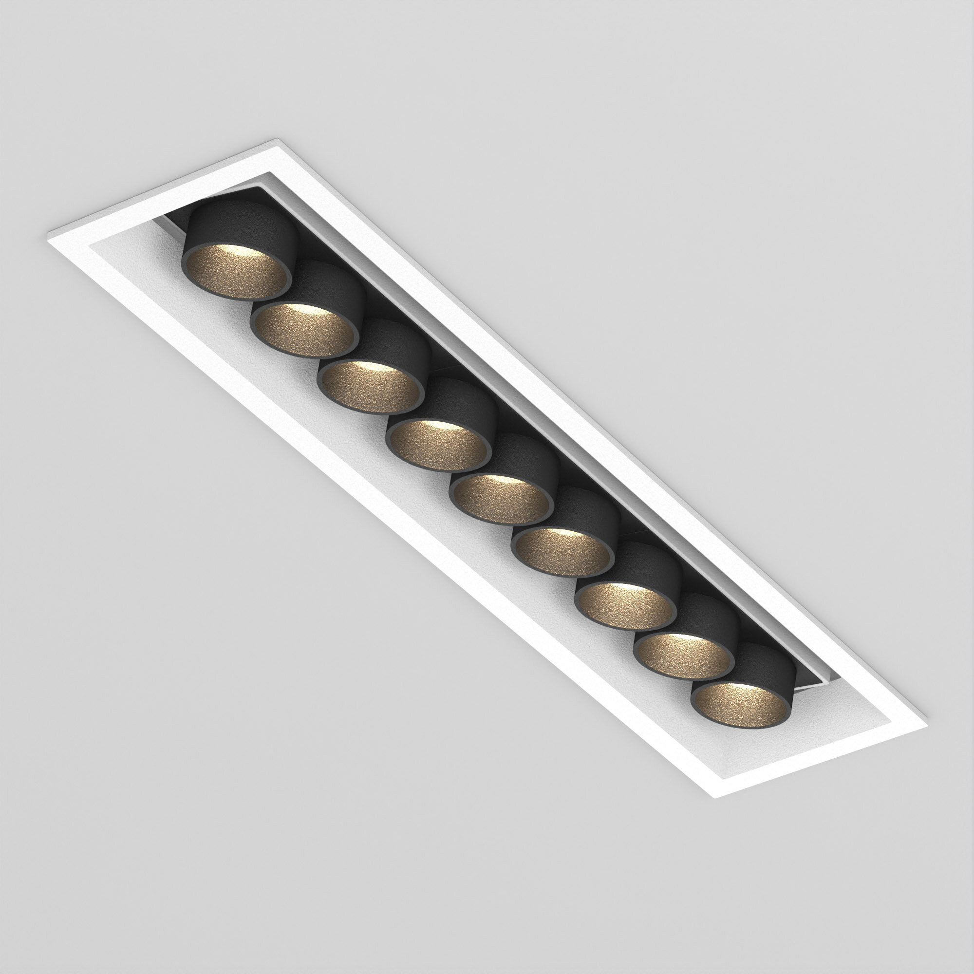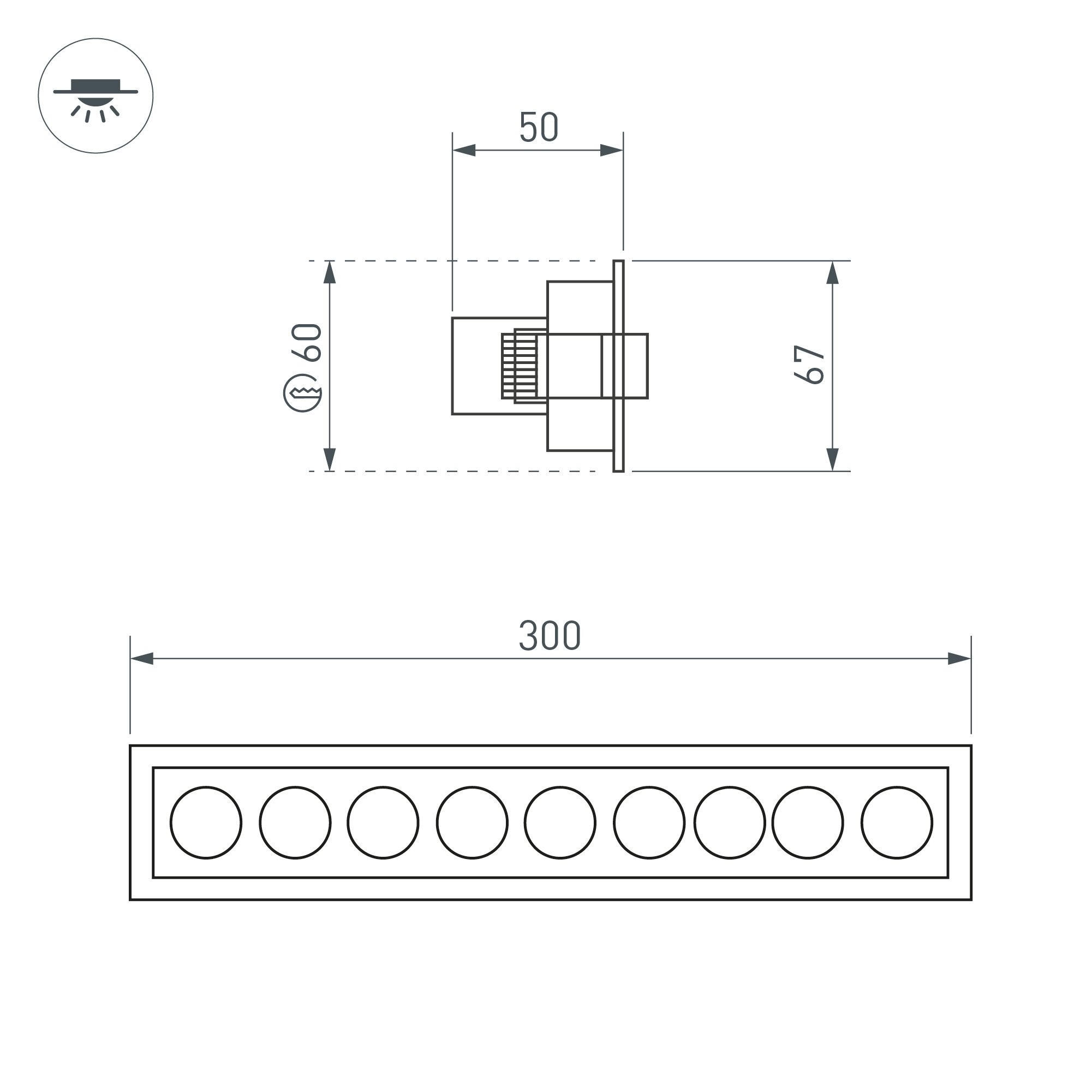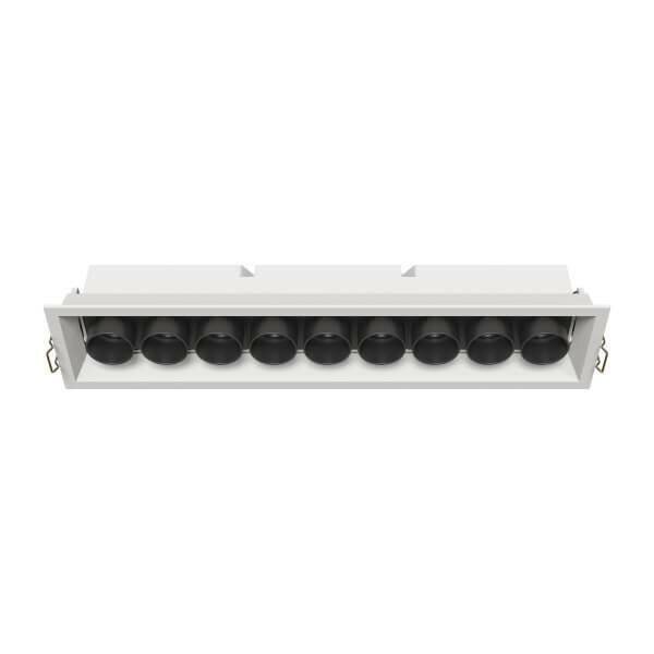 Встраиваемый поворотный светильник. Мощность 20 Вт, св. поток 1500 лм, 75 лм/Вт, теплый 3000 K, CRI>98, угол 30°, напряжение питания 230 В. Белый прямоугольный корпус из алюминия, экран PMMA, степень защиты IP20. Размер: длина 300 мм, ширина 67 мм, высота 50 мм. Монтаж встраиваемый, установочное отверстие длина 295 мм, ширина 60 мм. Драйвер 17-29 В, 700 мА, пульсация