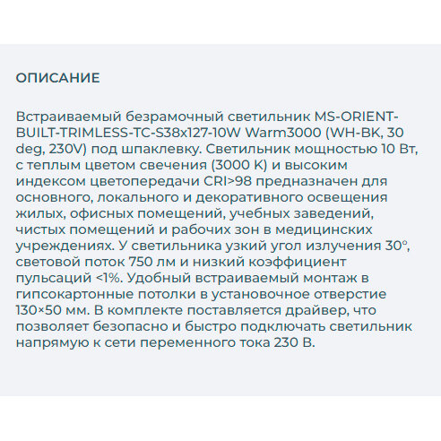 | Номенклатура | Светильник MS-ORIENT-BUILT-TRIMLESS-TC-S38x127-10W Warm3000 (WH-BK, 30 deg, 230V) (ARL, IP20 Металл, |