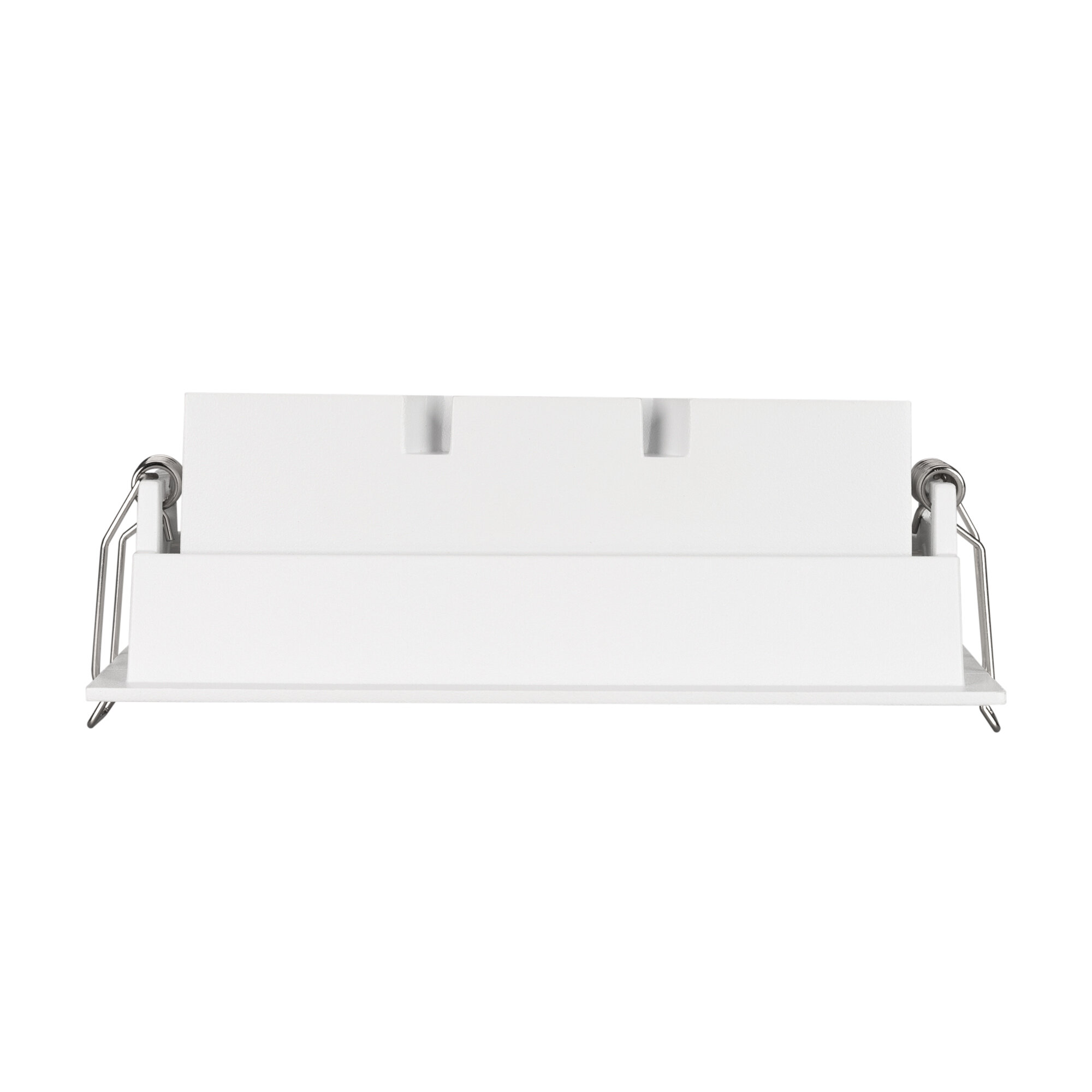 Встраиваемый поворотный светильник. Мощность 10 Вт, св. поток 750 лм, 75 лм/Вт, теплый 3000 K, CRI>98, угол 30°, напряжение питания 230 В. Белый прямоугольный корпус из алюминия, экран PMMA, степень защиты IP20. Размер: длина 150 мм, ширина 67 мм, высота 50 мм. Монтаж встраиваемый, установочное отверстие длина 145 мм, ширина 60 мм. Драйвер 9-14 В, 700 мА, пульсация