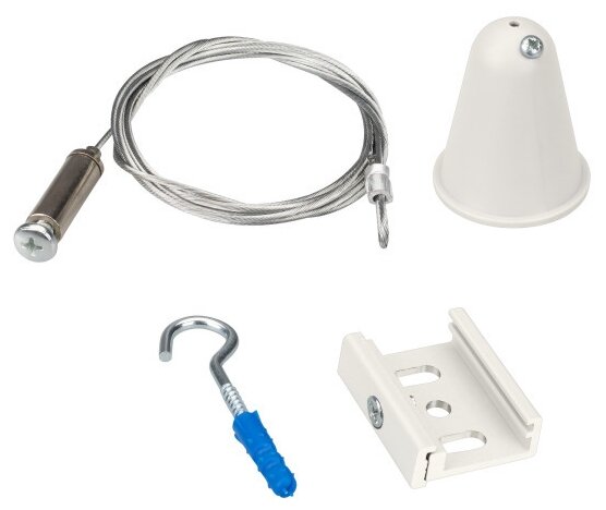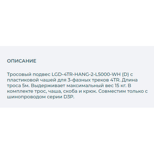 Тросовый подвес с пластиковой чашкой Ø36x47мм для треков 4TR. Длина троса 5 м. Цвет белый RAL9010. Выдерживает вес максимум 15 кг. В комплекте трос, чаша, скоба и крюк. Совместим только с шинопроводом серии D3P.