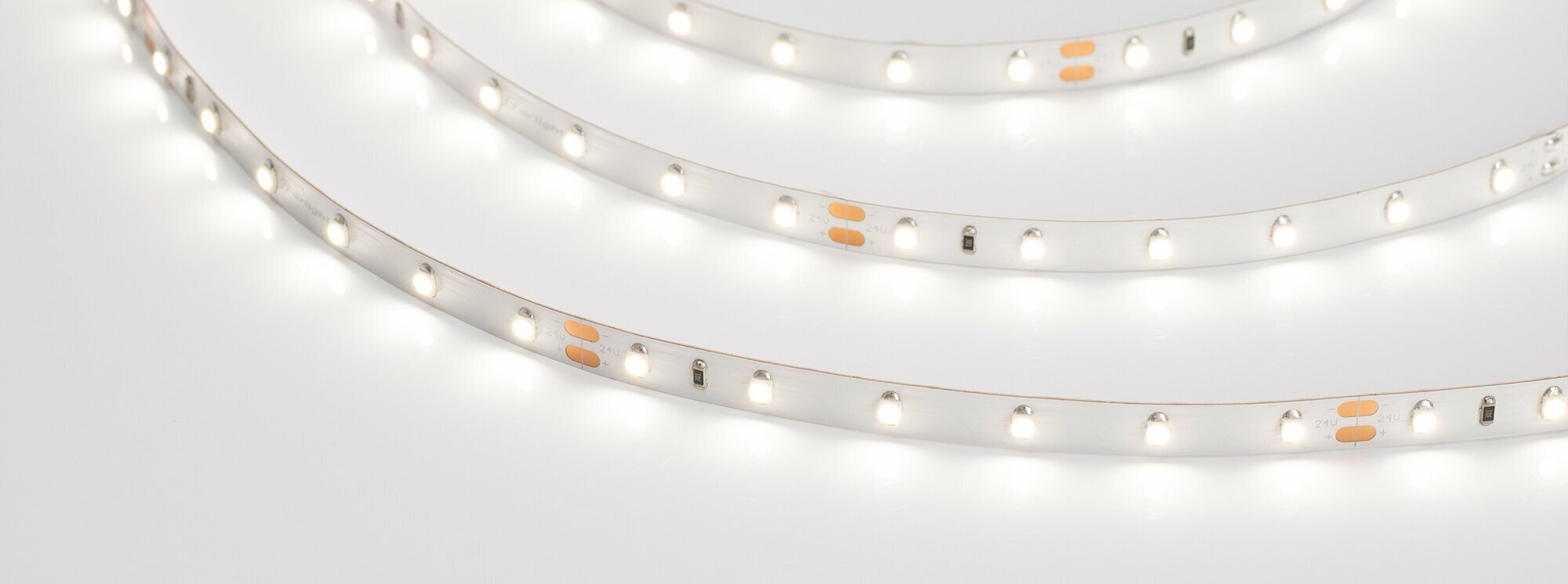 Светодиодная узкая лента RT-A120, открытая. Светодиоды 2835, 120 шт/м (600 шт на 5 м), белая плата, ширина 5 мм, скотч 3M. Цвет ДНЕВНОЙ 4000 K, цветопередача CRI>85, угол 120°. Питание 12V, мощность 9.6 Вт/м (48 Вт на 5 м). Размеры 5000x5x1.5 мм. Мин. отрезок 25 мм, 3 светодиода. Цена за 1 м.