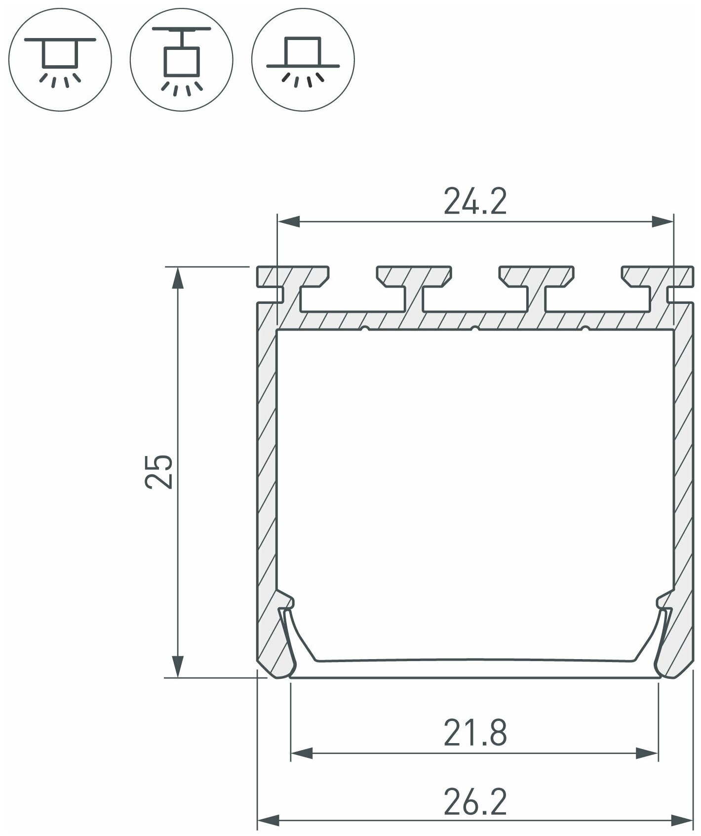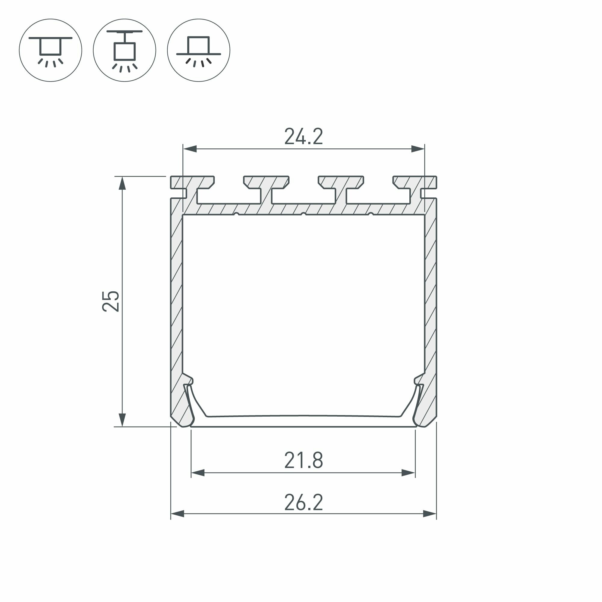 Накладной/подвесной/встраиваемый профиль черного цвета из анодированного алюминия для основного освещения и контурной подсветки. Габаритные размеры профиля составляют 2000 мм в длину, 26 мм в ширину и 25 мм в высоту. Площадка для установки светодиодных лент позволяет использовать ленту шириной до 24 мм и мощностью до 26,2 Вт/м. Это обеспечивает гибкость в выборе светодиодных лент и создает потрясающие световые решения. Отличное решение для создания современных световых проектов.