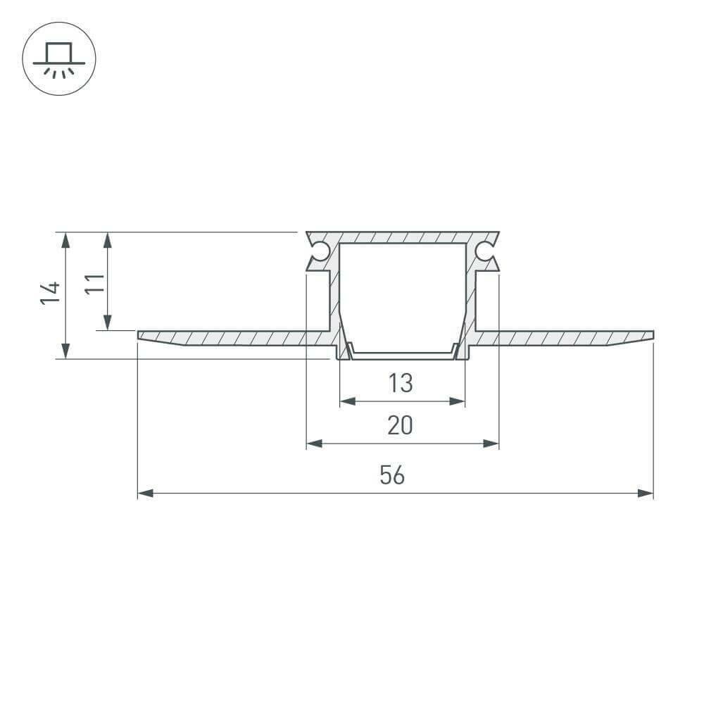 Алюминиевый встраиваемый профиль со скрытым фланцем под строительную отделку для основного освещения и контурной подсветки. Габаритные размеры профиля составляют 2000 мм в длину, 56 мм в ширину и 13,4 мм в высоту. Площадка для установки светодиодных лент позволяет использовать ленту шириной до 13,4 мм и мощностью до 31,4 Вт/м. Это обеспечивает гибкость в выборе светодиодных лент и создает потрясающие световые решения. Поставляется в комплекте с дополнительным экраном, который служит защитой профиля от пыли при монтаже. Отличное решение для создания современных световых проектов.