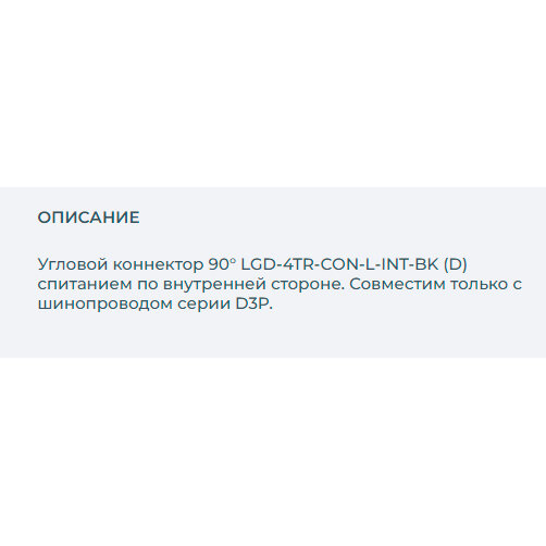 Угловой коннектор 90 градусов, питание по внутренней стороне. Цвет черный. Габаритные размеры 102х102х32.5мм. Совместим только с шинопроводом серии D3P.