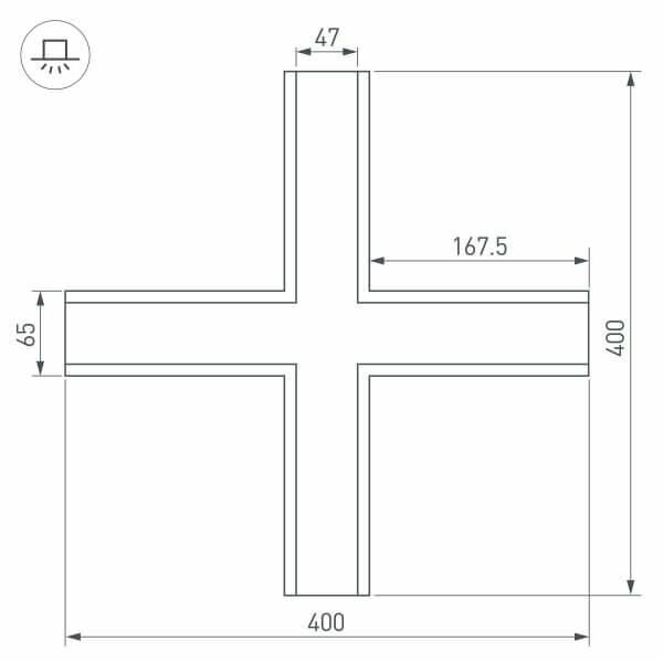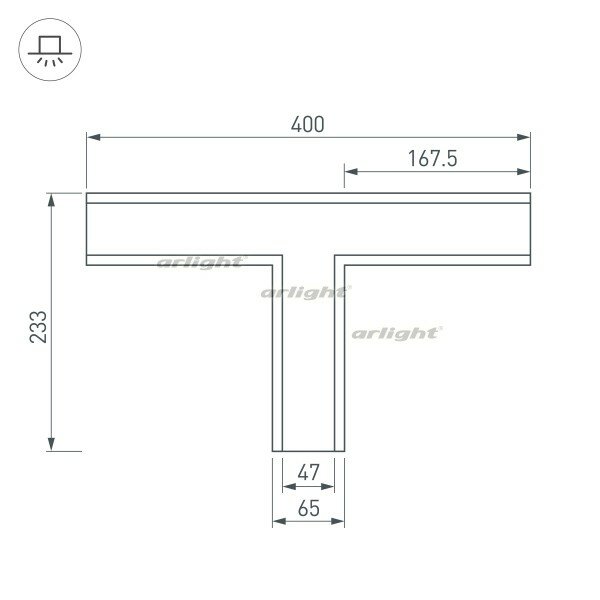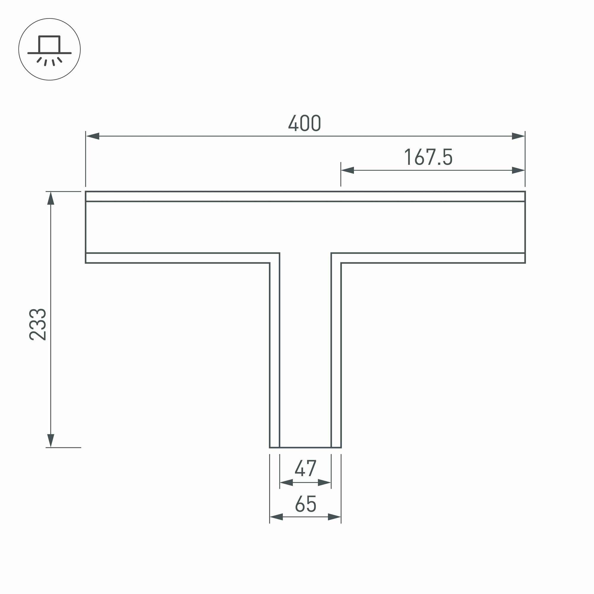 Т-образный угол в сборе с накладным фланцем для соединения трех профилей SL-LINIA65-F под прямыми углами 90° в одной плоскости в комплекте с матовым экраном и соединителями. Экран образует Т-образную фигуру на плоскости. Применятся при изготовлении светильников сложной геометрии. Длина внешней стороны угла 233 мм.