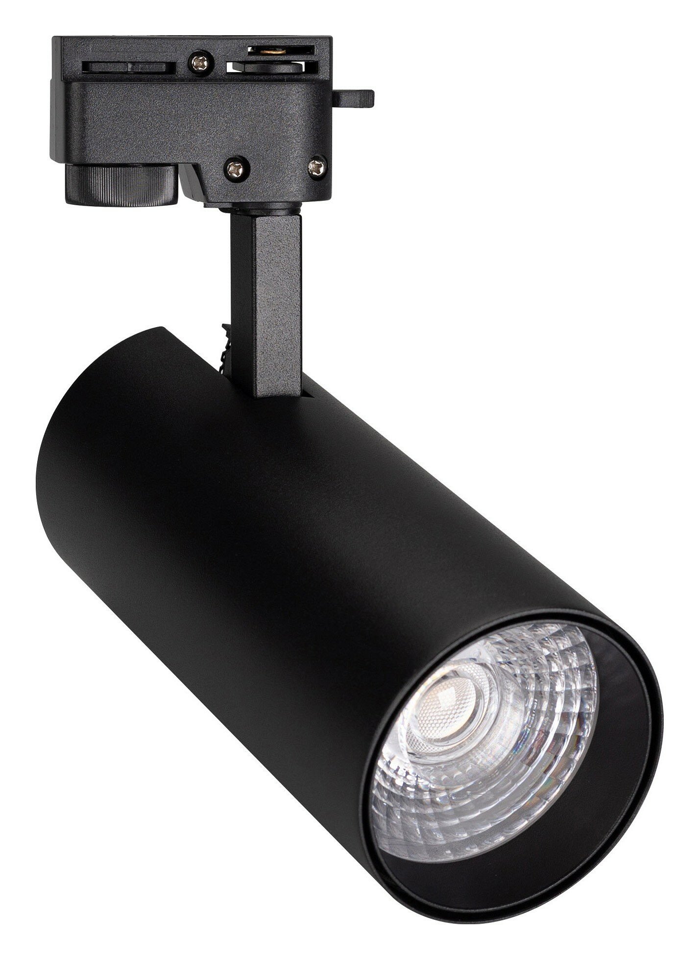 Светильник подвесной для треков/шин 2 провода. Мощность 20 Вт, св. поток 1800-2200 лм, 90 лм/Вт, дневной 4000 K, CRI>90, угол 24°, напряжение питания 230 В. Черный круглый корпус из алюминия, материал линзы PMMA , степень защиты IP20. Размер: диаметр 74 мм, высота 160 мм. Монтаж на трек 1-фазный. Драйвер встроенный 30-42 В, 500 мА., пульсация