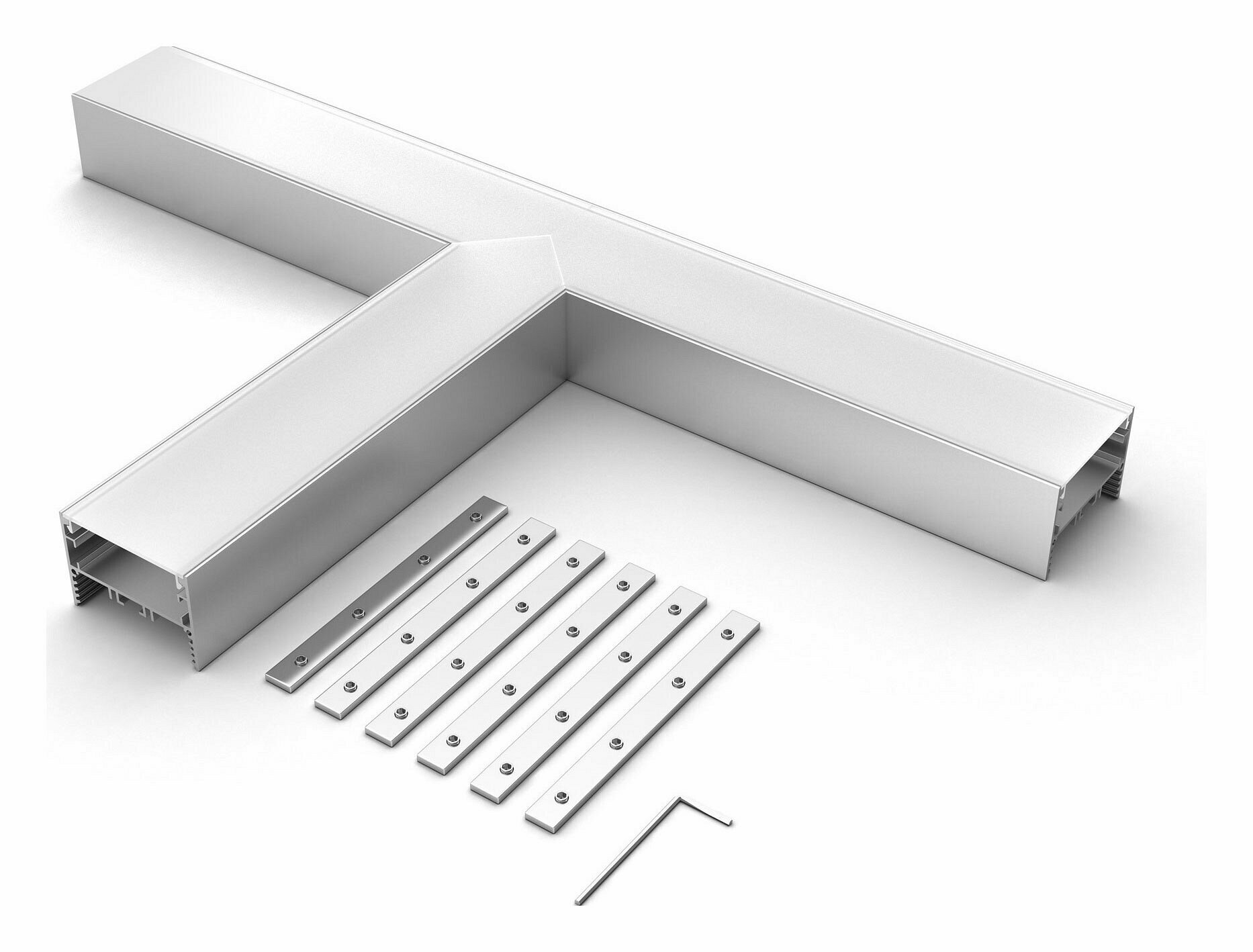Т-образный угол в сборе для соединения трех профилей SL-LINE-5035 под прямыми углами 90° в одной плоскости в комплекте с матовым экраном и соединителями. Экран образует Т-образную фигуру на плоскости. Применятся при изготовлении светильников сложной геометрии. Длина внешней стороны угла 225мм.