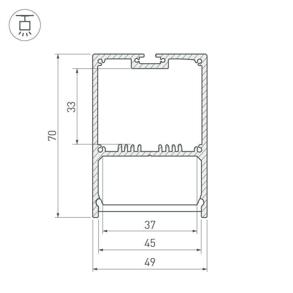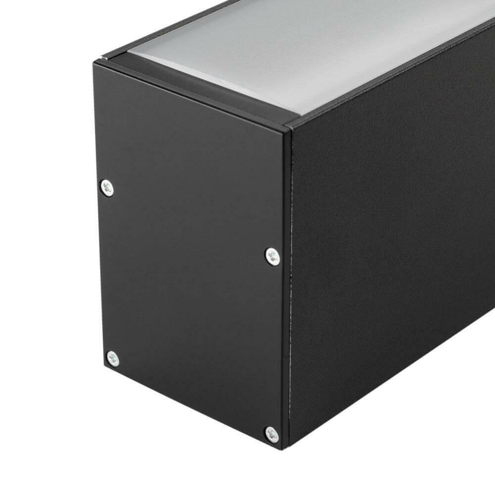 Подвесной/накладной профиль черного цвета из алюминия с отсеком для блока питания (33х45 мм) в комплекте с матовым рассеивателем из поликарбоната со светопропусканием 67% и заглушками идеально подходит для основного освещения и контурной подсветки. Габаритные размеры профиля составляют 2500 мм в длину, 49 мм в ширину и 70 мм в высоту. Площадка для установки светодиодных лент позволяет использовать ленту шириной до 37 мм и мощностью до 62,4 Вт/м. Это обеспечивает гибкость в выборе светодиодных лент и создает потрясающие световые решения. Отличное решение для создания современных световых проектов.