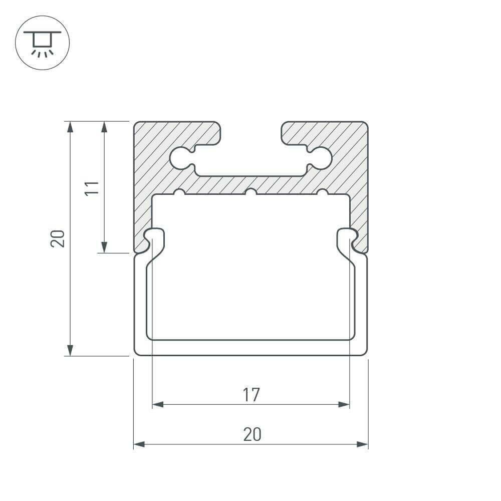 Комплект с экраном и заглушками (2 шт.). Алюминиевый профиль для светодиодных лент и линеек. Цвет - чёрный RAL9005 (порошковая окраска). Габаритные размеры (L×W×H): 2500x20x20 мм. Ширина площадки для ленты 16,5 мм. Аксессуары приобретаются отдельно. Цена за комплект.