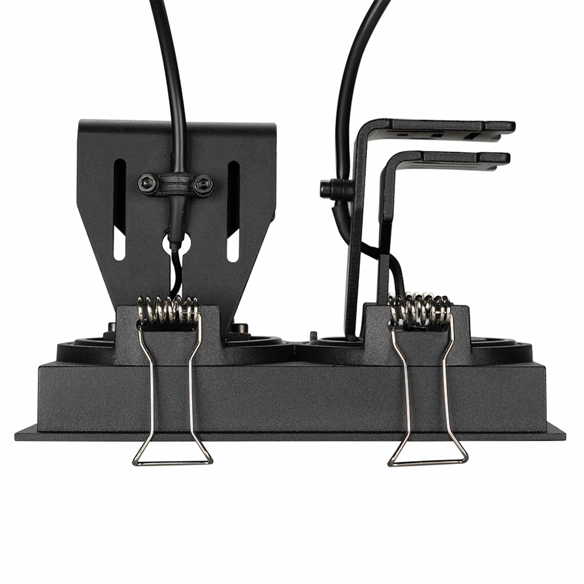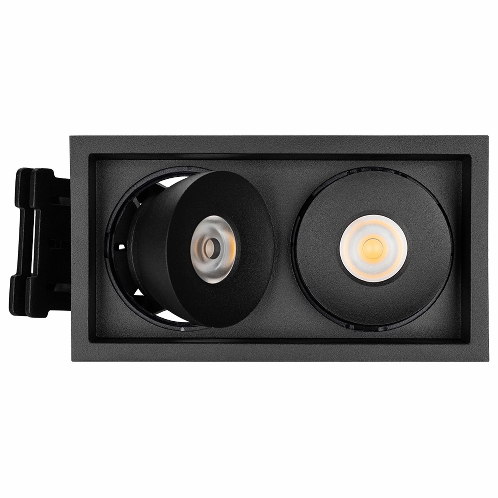 Встраиваемый карданный поворотный светильник CL-SIMPLE-S148x80-2x9W Day4000 (BK, 45 deg) мощностью 18 Вт с дневным цветом свечения (4000 K) и высоким индексом цветопередачи CRI>90 для создания качественного направленного освещения. За основу поворотного механизма светильника взят принцип кардана – подвижное соединение двух колец, вложенных одно в другое. В одном корпусе два независимых световых модуля, которые отклоняются на 45°, что позволяет с лёгкостью регулировать направление света и его концентрацию на определенной зоне. Особая конфигурация корпуса из черного алюминия позволяет эффективно отводить тепло, продлевая срок службы светодиодов. Светильник с узким углом рассеивания 45° и световым потоком 1260 лм отлично подходит для локальной акцентной подсветки витрин, прилавков магазинов, бутиков и стендов выставочных залов. Популярно совместное использование с трековыми системами или светильниками Downlight. Легко устанавливается с помощью пружин в монтажное отверстие размером 140х70 мм. В комплекте поставляются два драйвера, что позволяет безопасно и быстро подключать светильник напрямую к сети переменного тока 230 В.