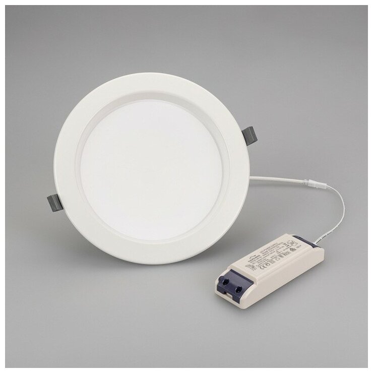 Встраиваемый светильник "Даунлайт" 30Вт. Цвет свечения ТЕПЛЫЙ БЕЛЫЙ 3000К. Световой поток 2610лм, угол 90°, CRI>80. Белый корпус. Питание AC220-240V. Габариты: Ø230х75мм, врезное отверстие Ø192-210мм. Драйвер в комплекте (25-43V, 700mA).