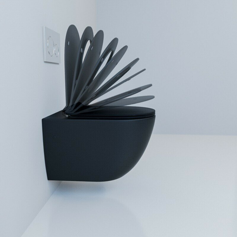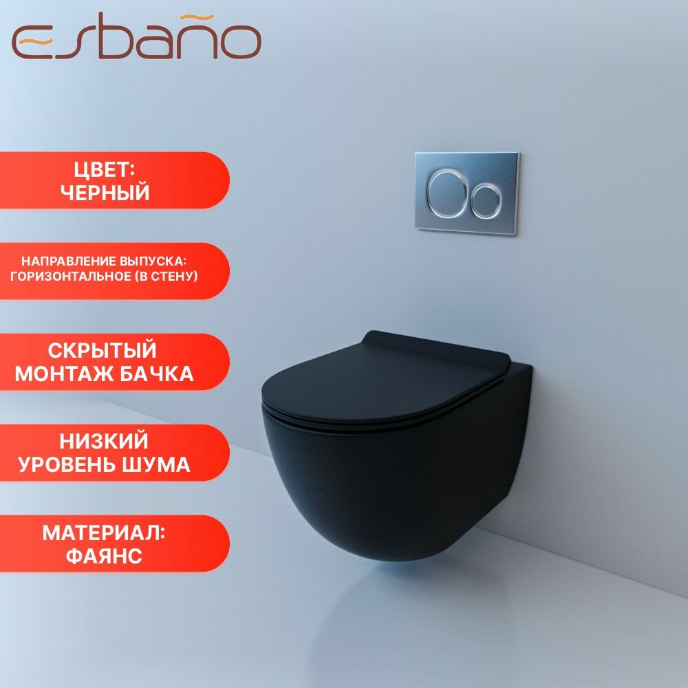 Унитаз подвесной ESBANO - GARCIA (Matt Black): унитаз с безободковой системой слива, горизонтальный выпуск, диаметр выпуска 100мм, материал: фаянс, сиденье: DUROPLAST с крышкой "soft-close" - плавное опускание (микролифт), быстросъемное, металлические накладки, металлический крепеж на петлях