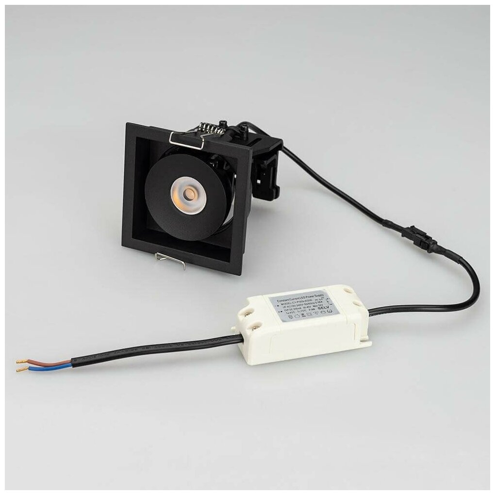 Встраиваемый карданный поворотный светильник CL-SIMPLE-S80x80-9W Day4000 (BK, 45 deg) мощностью 9 Вт, с дневным цветом свечения (4000 K) и высоким индексом цветопередачи CRI>90 для создания качественного направленного освещения. За основу поворотного механизма светильника взят принцип кардана. Световой модуль отклоняется на 45°, что позволяет с лёгкостью регулировать направление пучка света и его концентрацию на определенной зоне. Особая конфигурация корпуса из черного алюминия позволяет эффективно отводить тепло, продлевая срок службы светодиодов. Светильник с узким углом рассеивания 45° и световым потоком 630 лм отлично подходит для локальной акцентной подсветки витрин, прилавков магазинов, бутиков и стендов выставочных залов. Популярно совместное использование с трековыми системами или светильниками Downlight. Легко устанавливается с помощью пружин в монтажное отверстие 70х70 мм. В комплекте поставляется драйвер, что позволяет безопасно и быстро подключать светильник напрямую к сети переменного тока 230 В. Диммирование возможно при замене штатного драйвера.