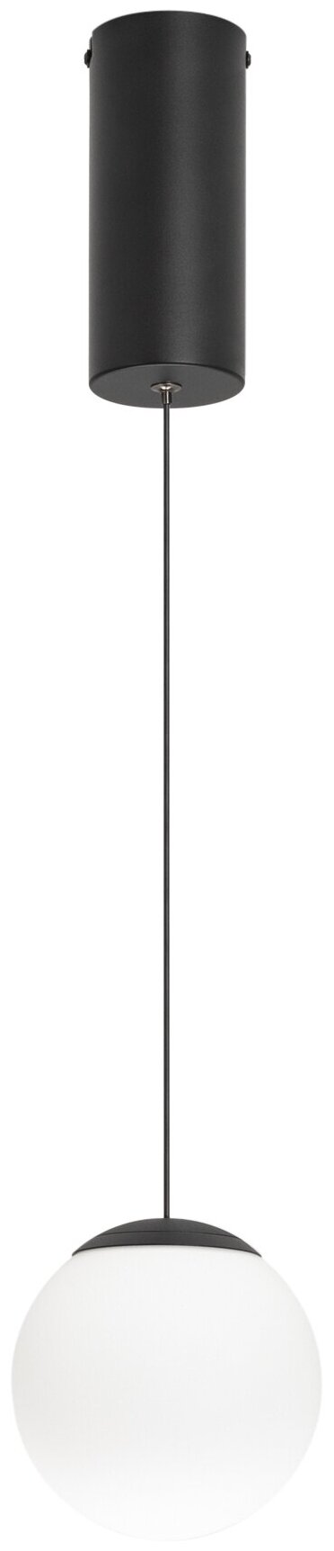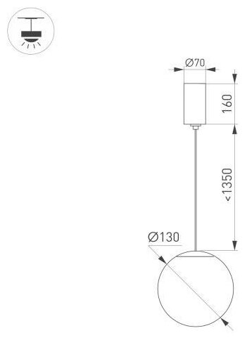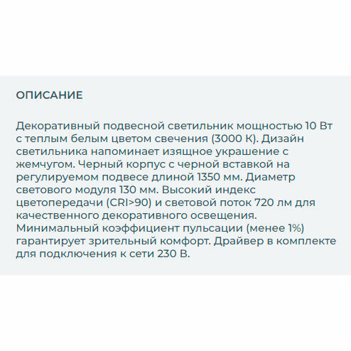 Подвесной светильник. Мощность 10 Вт, св. поток 720 лм, 70 лм/Вт, теплый 3000 K, CRI>90, угол 250°, напряжение питания 230 В. Черный круглый корпус из алюминия и стали, рассеиватель стекло, степень защиты IP20. Размер: диаметр 130 мм, размер чаши: диаметр 70 мм, высота 160 мм. Монтаж подвесной, длина подвеса 1350 мм. Драйвер 6-14 В, 600 мА, пульсация