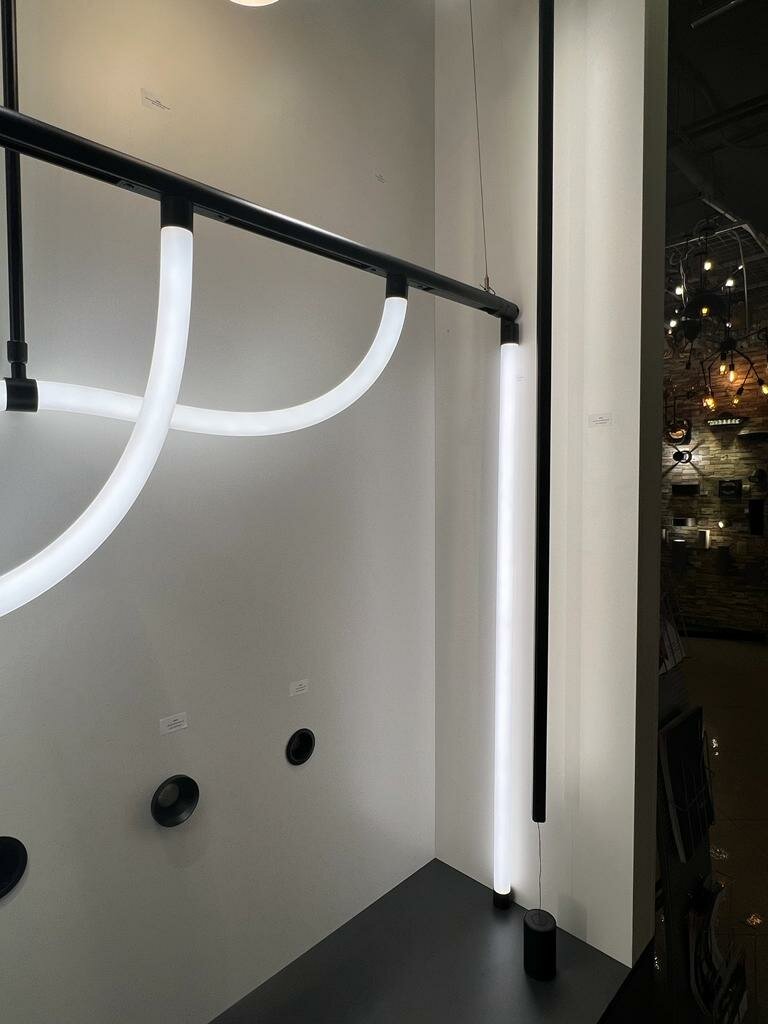 Декоративный светильник для подсветки стен. Мощность 14 Вт, св. поток 650 лм, 45 лм/Вт, дневной 4000 K, CRI>80, угол 90°, напряжение питания 230 В. Черный фигурный корпус из алюминия, экран из силикона, степень защиты IP20. Размер светоизлучающего модуля: длина 1293 мм, ширина 26 мм, высота 18 мм; Размер потолочной чаши:54*105 мм; Размер основания: 49*90 мм; Максимальная длина подвеса: 1300+2000 мм. Монтаж накладной. Пульсация
