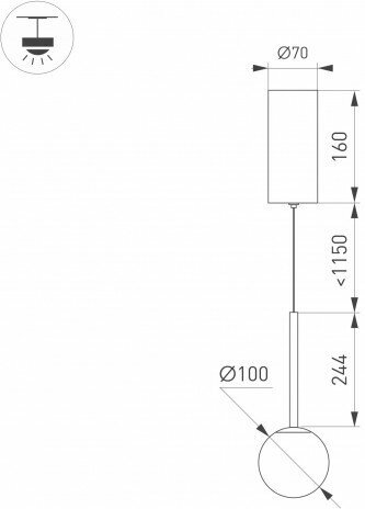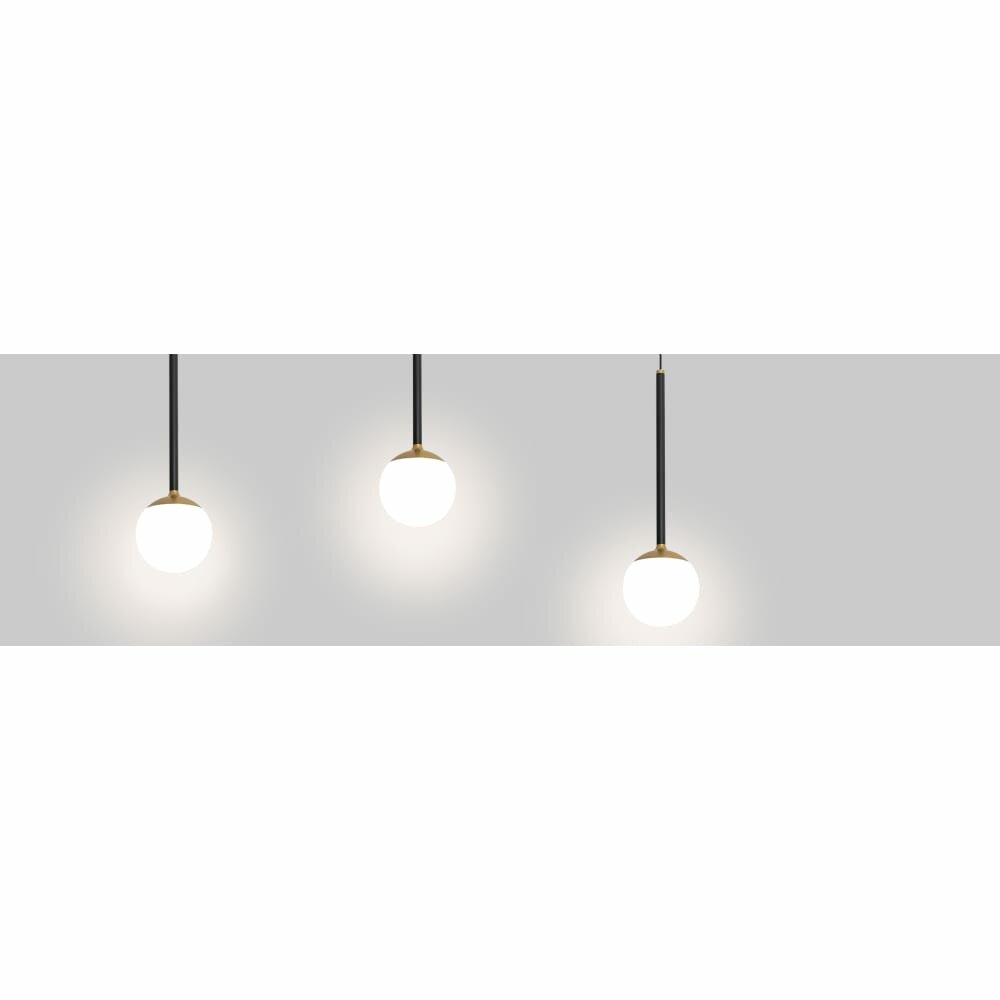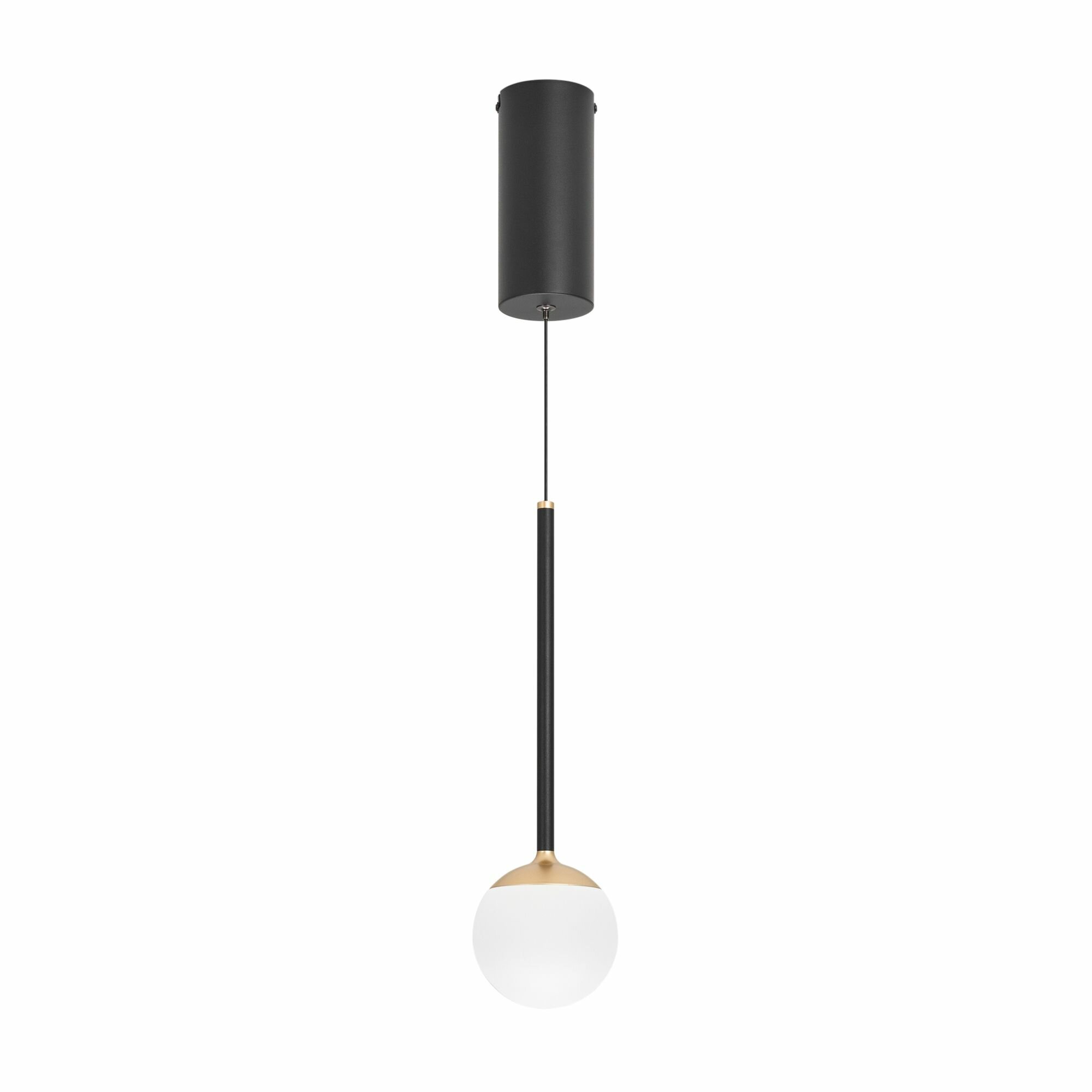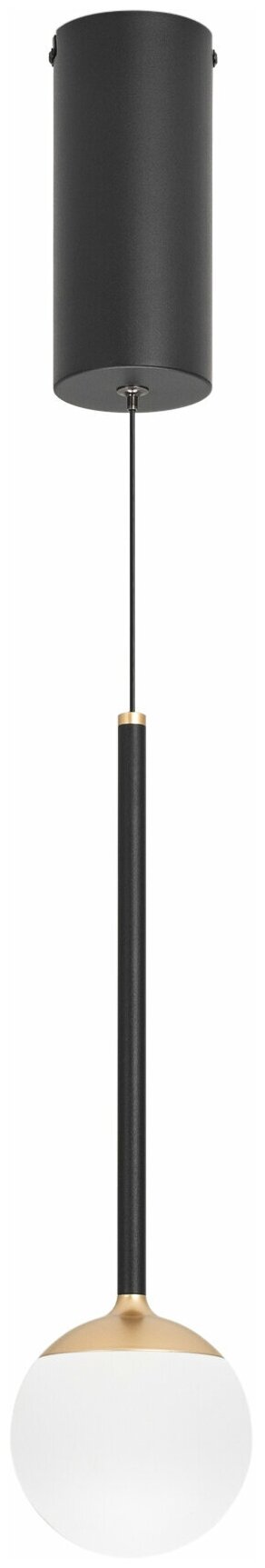 Подвесной светильник. Мощность 8 Вт, св. поток 620 лм, 80 лм/Вт, дневной 4000 K, CRI>90, угол 180°, напряжение питания 230 В. Черно-золотой круглый корпус из алюминия и стали, рассеиватель акрил, степень защиты IP20. Размер: диаметр 100 мм, высота ножки 244 мм, высота с плафоном 351 мм, размер чаши: диаметр 70 мм, высота 160 мм. Монтаж подвесной, длина подвеса 1150 мм. Драйвер 13-24 В, 300 мА, пульсация