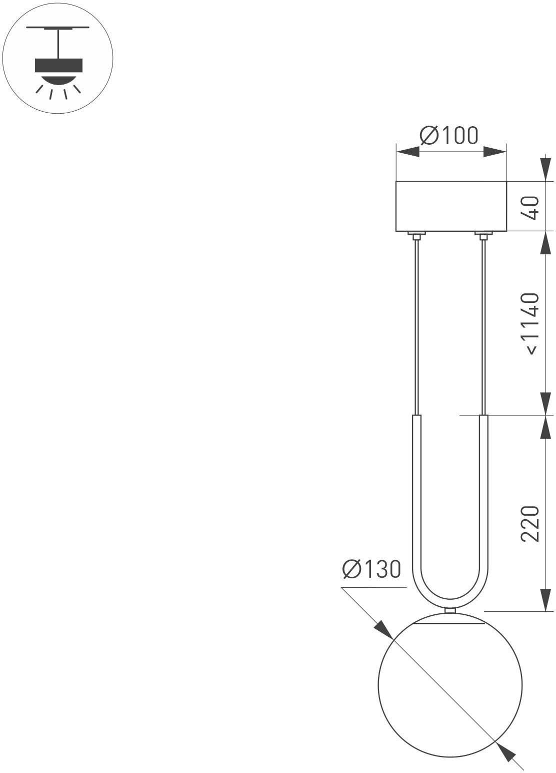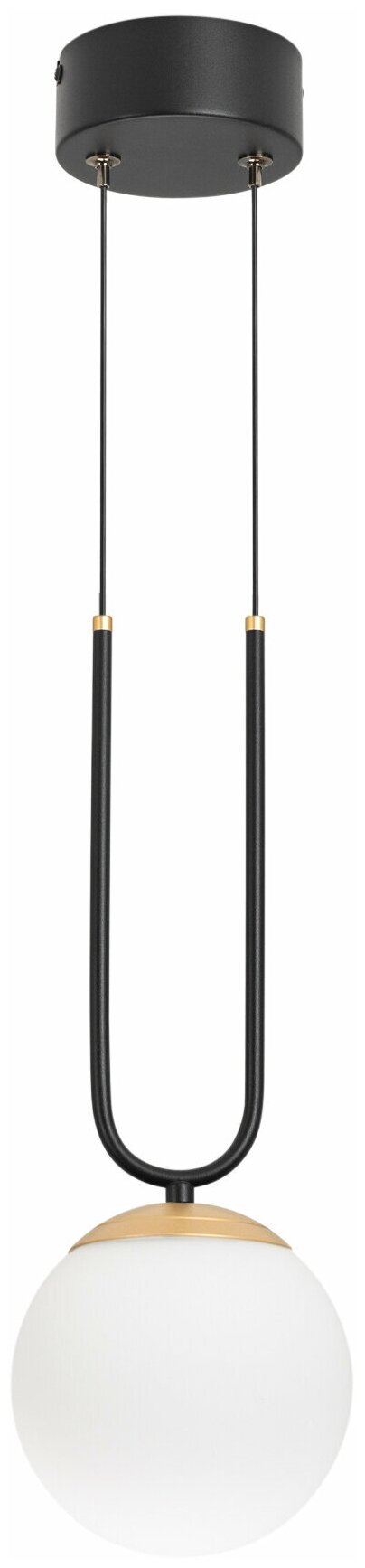 Подвесной светильник. Мощность 10 Вт, св. поток 710 лм, 71 лм/Вт, теплый 3000 K, CRI>90, угол 275°, напряжение питания 230 В. Черно-золотой круглый корпус из алюминия и стали, рассеиватель стекло, степень защиты IP20. Размер: диаметр 130 мм, высота ножки 220 мм, высота с плафоном 357 мм, размер чаши: диаметр 100 мм, высота 40 мм. Монтаж подвесной, длина подвеса 1140 мм. Драйвер 6-14 В, 600 мА, пульсация