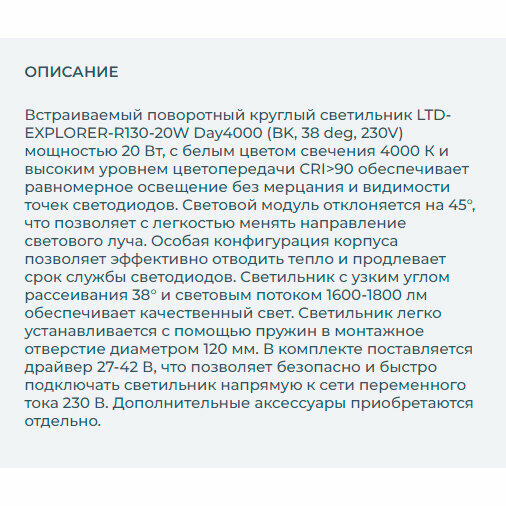 Встраиваемый поворотный круглый светильник LTD-EXPLORER-R130-20W Day4000 (BK, 38 deg, 230V) мощностью 20 Вт, с белым цветом свечения 4000 К и высоким уровнем цветопередачи CRI>90 обеспечивает равномерное освещение без мерцания с отличным восприятием цветов. Корпус светильника диаметром 129 мм поворачивается вокруг своей оси на 350° и отклоняется на 45°, что позволяет менять направление светового луча. Особая конфигурация корпуса позволяет эффективно отводить тепло и продлевает срок службы светодиодов. Светильник с узким углом рассеивания 38° и световым потоком 1600-1800 лм обеспечивает качественный свет. Легко устанавливается с помощью пружин в монтажное отверстие диаметром 120 мм. В комплекте поставляется драйвер 27-42 В, что позволяет безопасно и быстро подключать светильник напрямую к сети переменного тока 230 В. Возможно диммирование при замене штатного драйвера. Предназначен для направленного и локального освещения в жилых, коммерческих и общественных помещениях, где отсутствует контакт с водой.