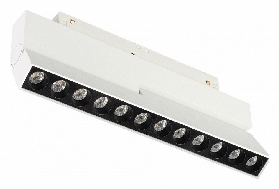 Светильник для магнитных треков MAG-ORIENT шириной 26 мм. Мощность 12 Вт, св. поток 520 лм, 43 лм/Вт, теплый 3000 K, CRI>90, угол 30°, напряжение питания 48 В. Белый прямоугольный корпус из металл, экран поликарбонат, степень защиты IP20. Размер: длина 231 мм, ширина 23 мм, высота 107 мм. Монтаж на трек MAG-ORIENT. Пульсация