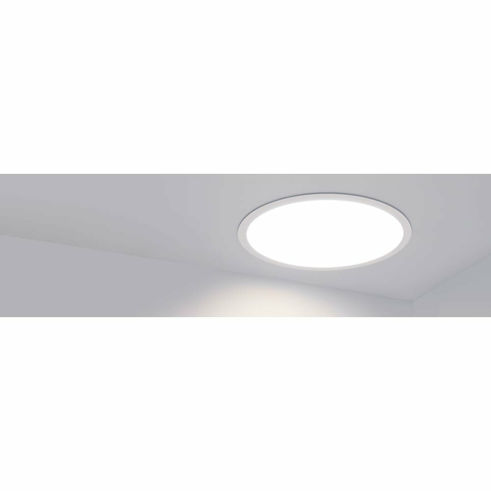 Встраиваемая круглая тонкая панель. Мощность 24 Вт, св. поток 1970 лм, 82 лм/Вт, дневной 4000 K, CRI>80, угол 115°, напряжение питания 230 В. Белый круглый корпус из алюминия, экран PMMA+PS, степень защиты IP40. Размер: диаметр 300 мм, высота 12 мм. Монтаж встраиваемый, установочное отверстие: диаметр 286 мм. Драйвер 33-40 В, 600 мА, пульсация