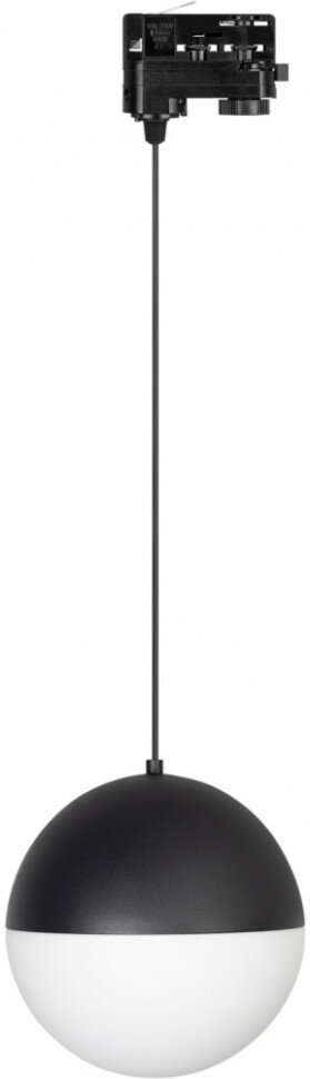Светильник подвесной для треков/шин 4 провода. Мощность 11 Вт, св. поток 960 лм, 80 лм/Вт, теплый 3000 K, CRI>90, угол 170°, напряжение питания 230 В. Черный корпус из алюминия, материал плафона стекло, степень защиты IP20. Размер: диаметр 150 мм, длина подвеса 1500 мм. Монтаж на трек 3-фазный. Драйвер 28-42 В, 250 мА, пульсация
