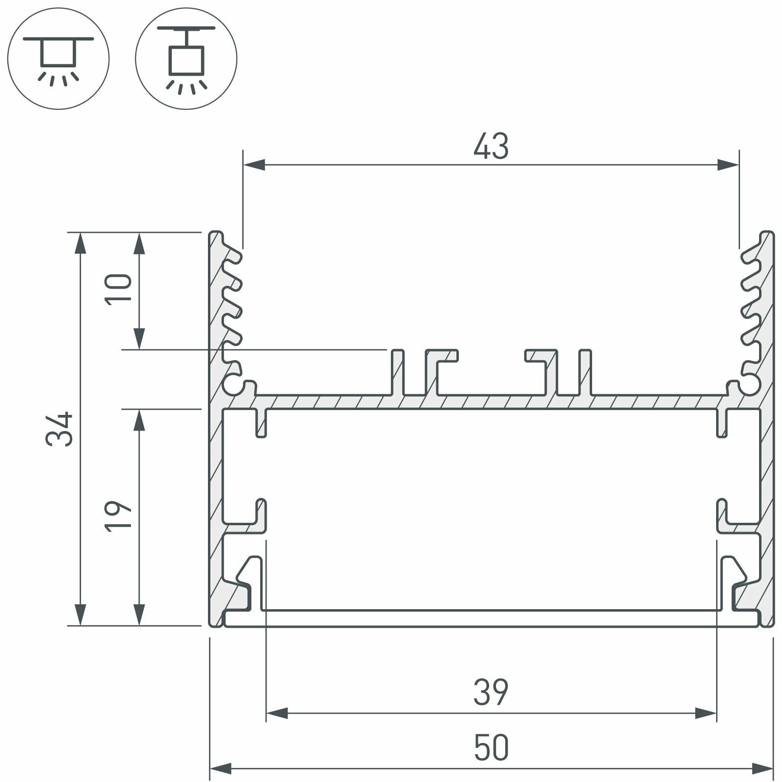 Подвесной/накладной профиль из анодированного алюминия для основной и контурной подсветки помещений. Габаритные размеры профиля составляют 2000 мм в длину, 50 мм в ширину и 34 мм в высоту. Площадка для установки светодиодных лент позволяет использовать ленту шириной до 38 мм и мощностью до 44,4 Вт/м. Это обеспечивает гибкость в выборе светодиодных лент и создает потрясающие световые решения. Отличное решение для создания современных световых проектов.