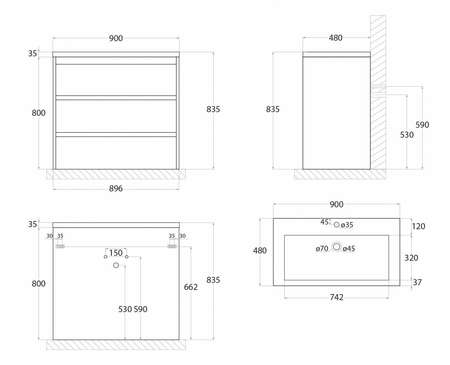- Размеры (ШхВхГ): 896х800х480 мм.