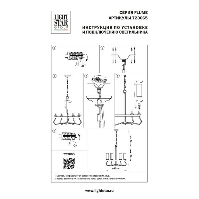 Подвесная люстра Lightstar Flume создана для оформления современных помещений, создания в них комфортного уровня освещенности. Она является основным источником, украсит своим присутствием помещение. Количество ламп составляет 6 шт. Показатель имеет значение при выборе. Еще понадобится учесть, что высота составляет 380 мм. Обе характеристики помогут определиться, насколько люстра соответствует` определенной комнате. Мы предлагаем выбрать данное осветительное оборудование, чтобы оно создавало комфорт многие годы. Степень защиты составляет 20 IP. Рекомендуемая люстра будет подчеркивать стиль пространства, эффективно освещать площадь. Она подойдет для гостиной. Обратите внимание, что вся коллекция Flume характеризуется изысканностью.