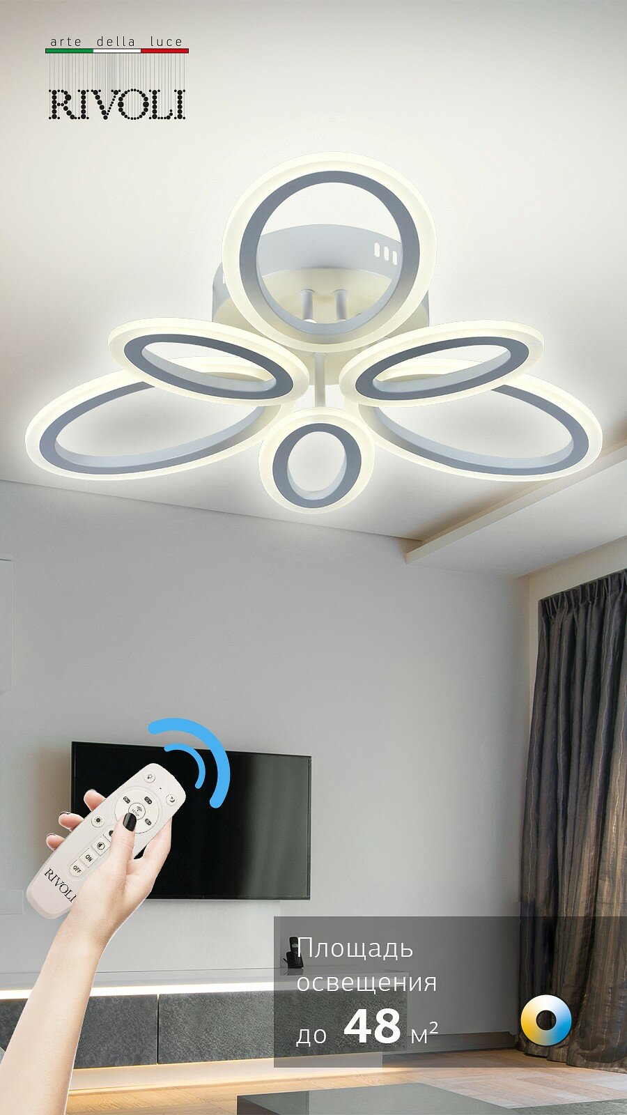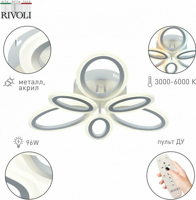 Люстра потолочная Kora светодиодная с пультом 96 Вт 3000К-6000К LED - продукт известной компании Rivoli (Италия). Имеет максимальную мощность 96 Вт, освещает площадь до 29 кв. м. Отлично подойдет для таких мест, как гостиная, кафе, спальня, кабинет, магазин. Впишется в интерьеры следующих стилей: модерн, современный.
