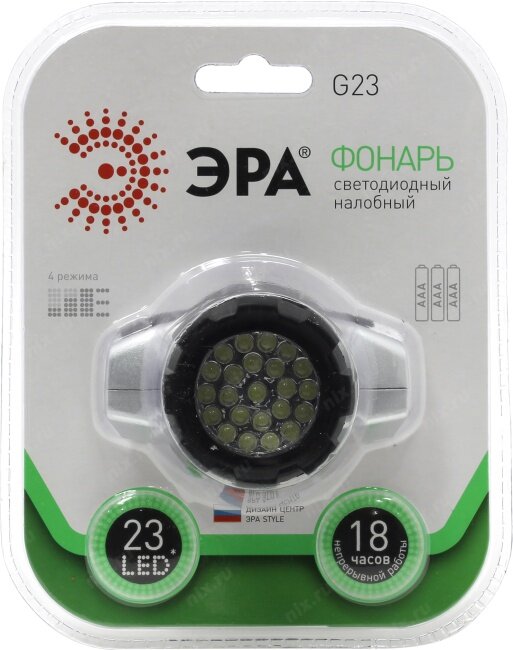 | Прочие особенности и свойства | Налобный фонарь ЭРА G23 Светодиодный налобный фонарь с 23 белыми светодиодами и 4 режимами работы. Рекомендуется к использованию в походах, кемпинге, путешествиях, альпинизме, езде на велосипеде. Материал:ударопрочный пластик Упаковка:двойной запаянный блистер Источник питания |