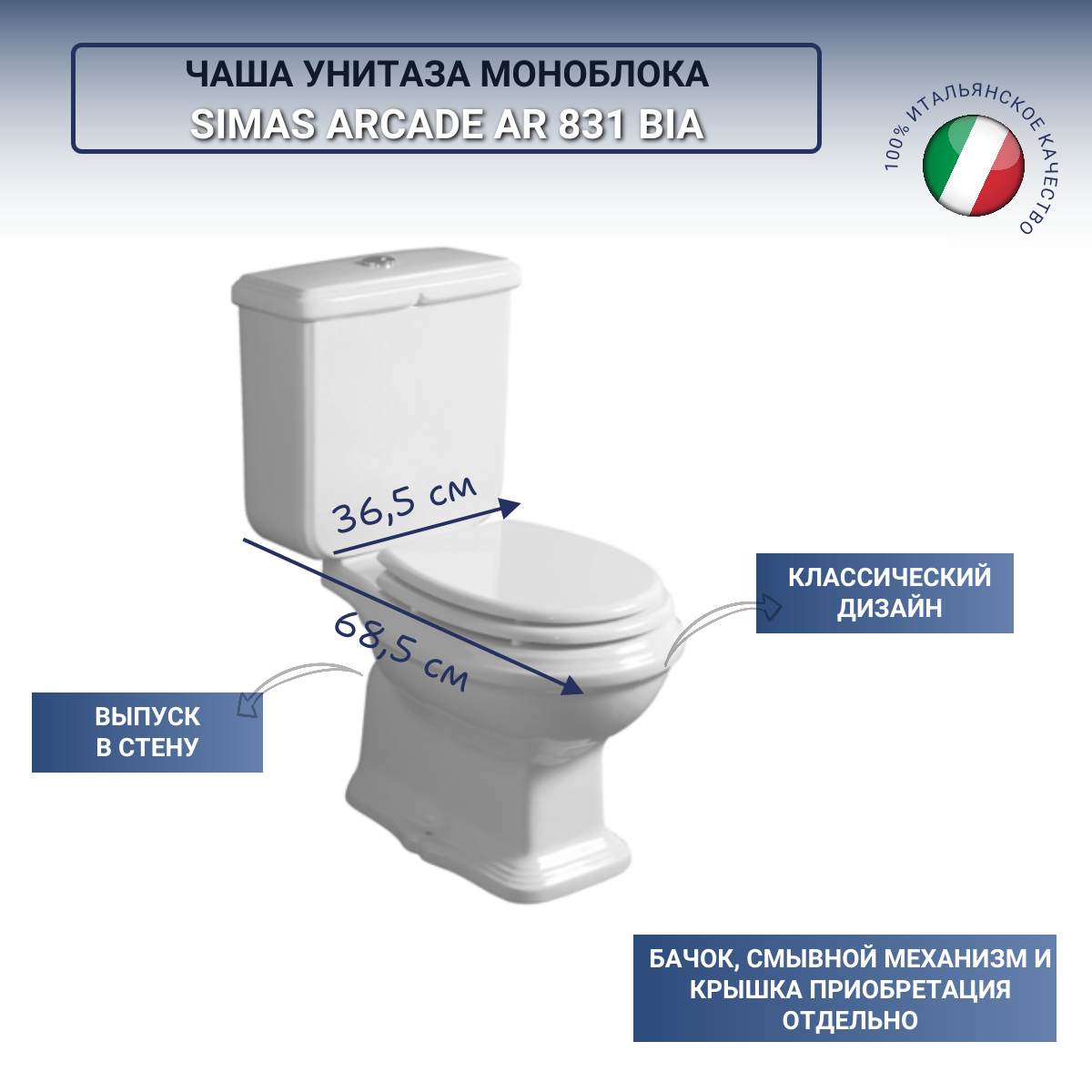 Овальная форма унитаза Simas Arcade длиной 68.5 см, шириной 36.5 см, высотой 39 см, позволяет гармонично установить унитаз. Simas Arcade выполнен в стиле ретро, что позволит создать уютную атмосферу данного направления дизайна. Горизонтальный (в стену) выпуск унитаза Simas Arcade обеспечит отличную проходимость, но этот параметр обязательно нужно учесть при монтаже. Материал унитаза фаянс отличается высокой гигиеничностью, надежностью и выполнен с соблюдением стандартов качества.