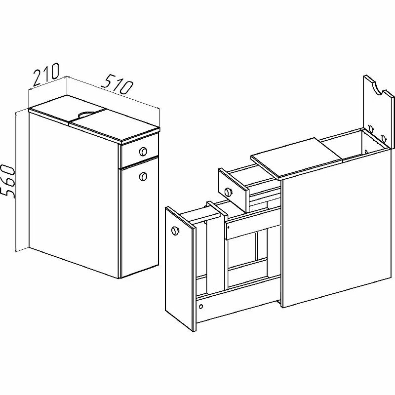 Полупенал для ванной Runo Комбо . Удобная и компактная тумба в ванную (полупенал) Комбогармонично впишется в любой маленький санузел или ванную комнату. Несмотря на небольшие габариты, тумба очень функциональна и вместительна благодаря двум выдвижным ящикам разной глубины и высоты. Сверху имеется маленькое отделение с откидной дверкой для размещения мелких аксессуаров.