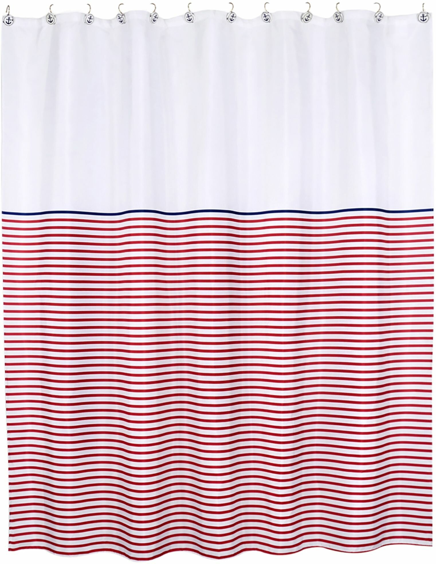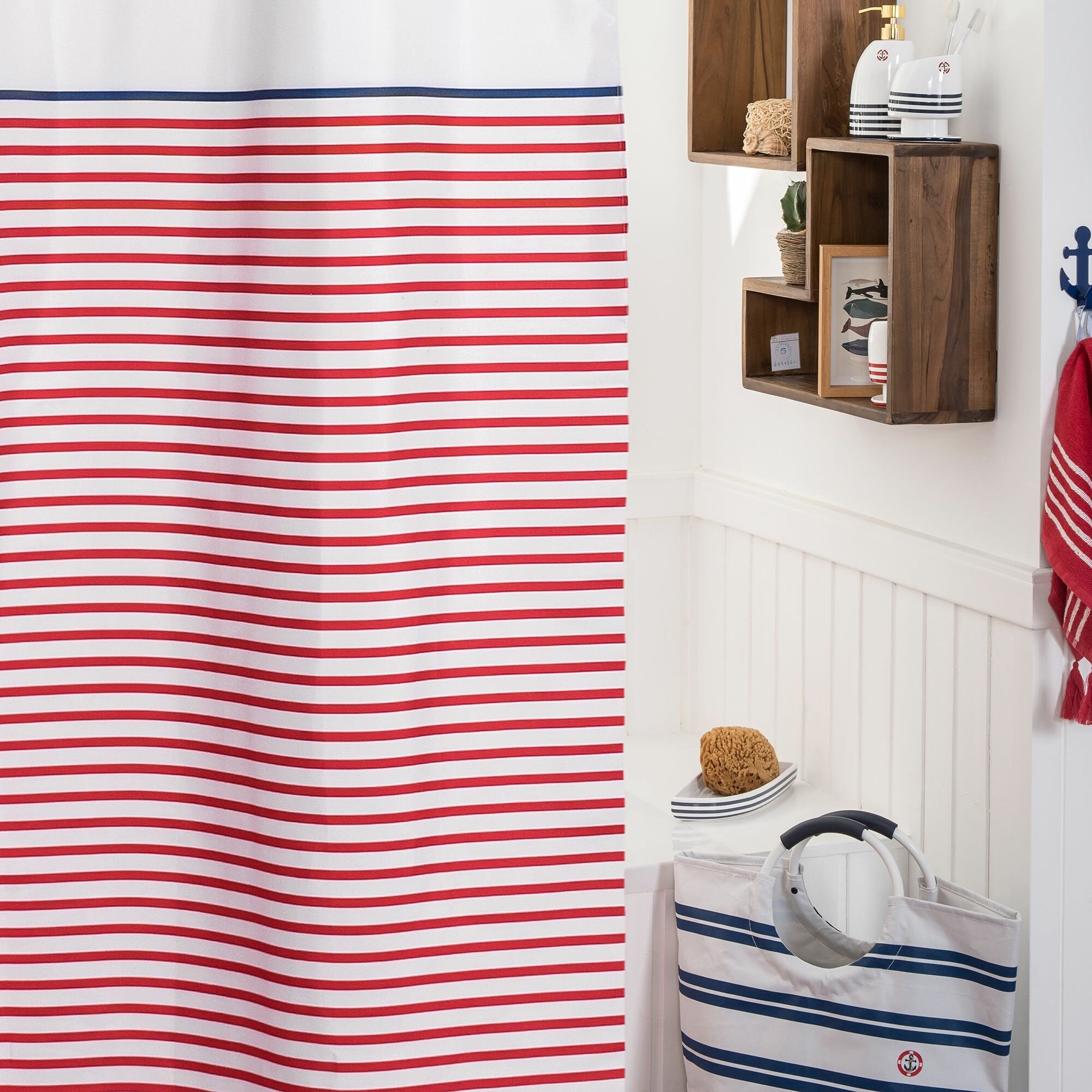 Белая занавеска с каймой из красных горизонтальных полос выглядит лаконично и подходит ванной, в дизайне которой использованы аналогичные цвета. Штора, обработанная высококачественной пропиткой, хорошо защитит помещение от брызг и надолго сохранит свой первоначальный вид. Изделие имеет 12 металлических люверсов для колец и утяжеляющую полоску, благодаря которой край шторы не мнется и не закручивается.