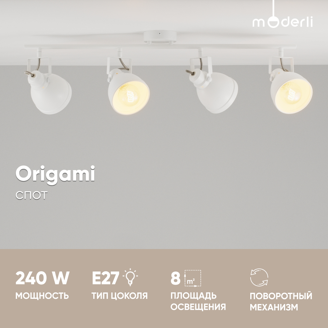 Спот Origami - продукт известной компании Moderli (Италия). Имеет максимальную мощность 240 Вт, освещает площадь до 8 кв. м. Отлично подойдет для таких мест, как гостиная, прихожая и коридор, спальня. Впишется в интерьеры следующих стилей: современный.