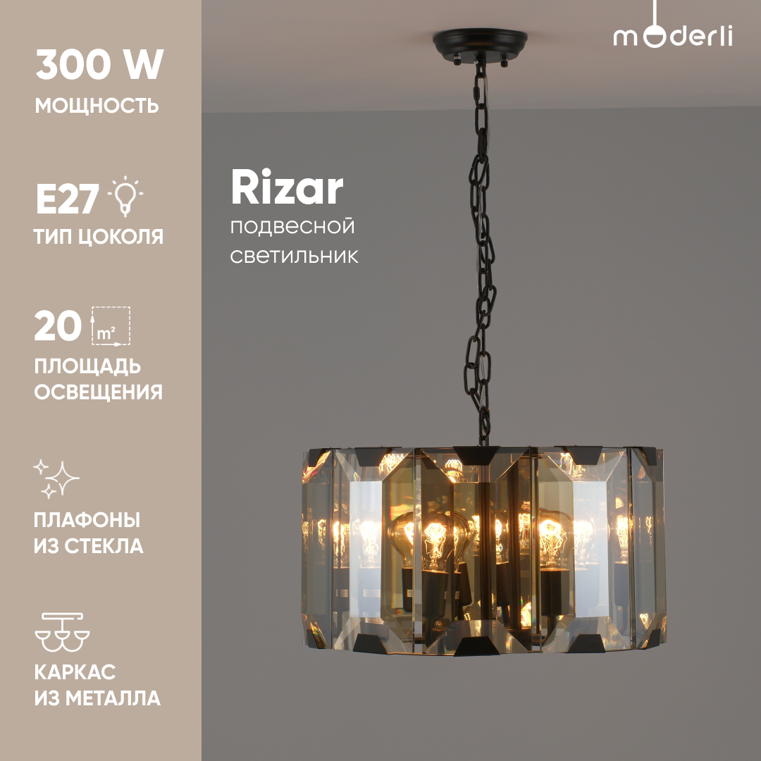 Подвесная люстра Rizar - продукт известной компании Moderli (Италия). Имеет максимальную мощность 300 Вт, освещает площадь до 20 кв. м. Отлично подойдет для таких мест, как гостиная, спальня, кабинет, кухня, над обеденным столом. Впишется в интерьеры следующих стилей: современный.