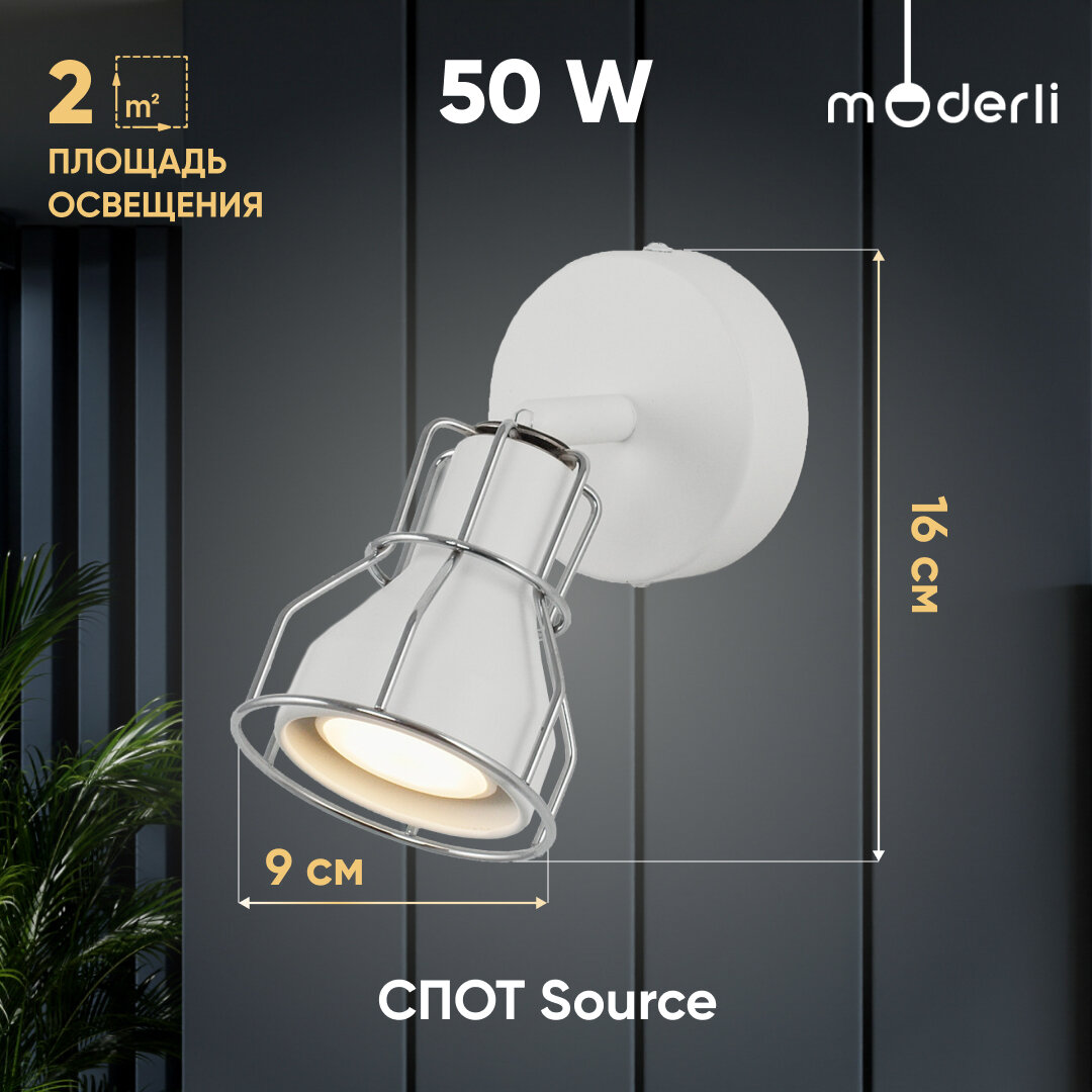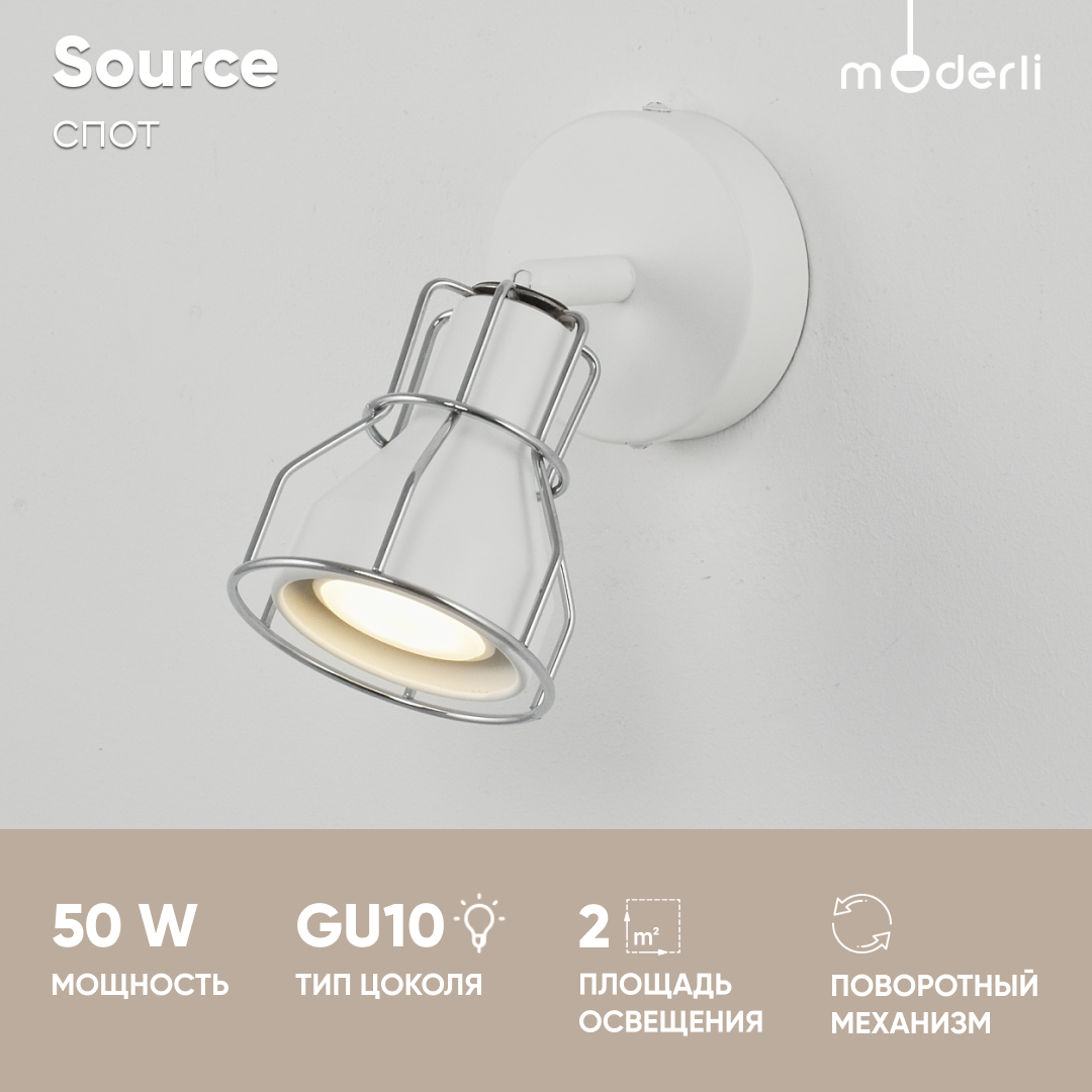 Спот Source - продукт известной компании Moderli (Италия). Имеет максимальную мощность 50 Вт, освещает площадь до 2 кв. м. Отлично подойдет для таких мест, как гостиная, прихожая и коридор, спальня, кухня, кабинет. Впишется в интерьеры следующих стилей: современный.
