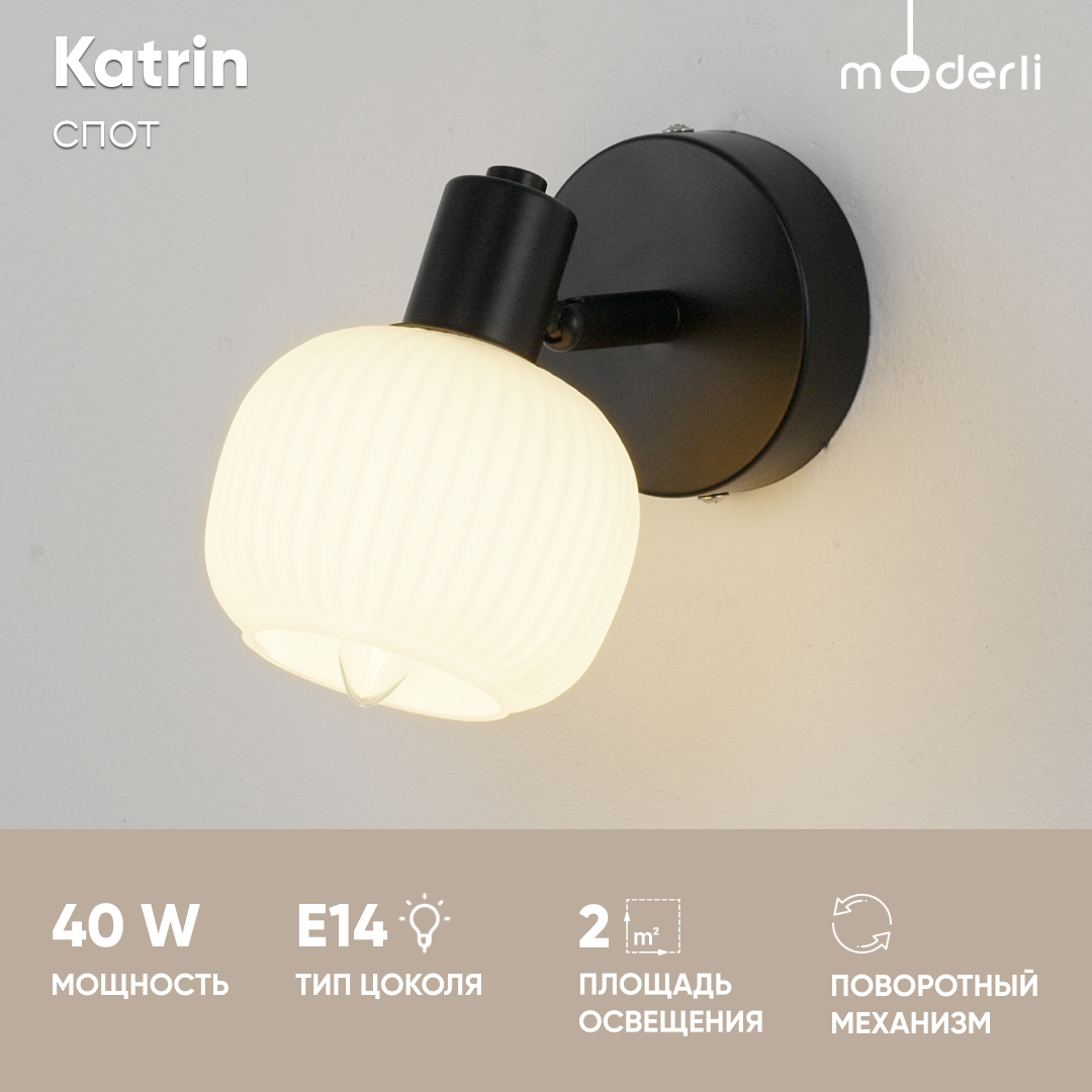 Спот Katrin - продукт известной компании Moderli (Италия). Имеет максимальную мощность 40 Вт, освещает площадь до 2 кв. м. Отлично подойдет для таких мест, как гостиная, прихожая и коридор, спальня. Впишется в интерьеры следующих стилей: лофт.